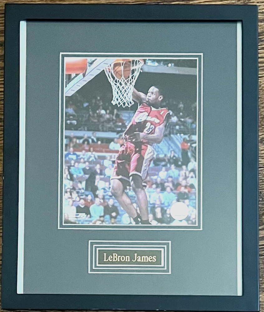 LEBRON JAMES 2003 Rookie NBA Game Photo CAVS ~ Limited Edition Hologram Seal NBA, and Photo File mark from 2003. Matted with engraved Lebron James name plate and nice heavy duty wood black frame. Approximate 18" x 14" black wood frame with glass. Condition: Minty condition and been in box in storage for 18 years ~ Please see all photos for best description of condition. Shipping: USPS First Class Mail with insurance. No International shipping available