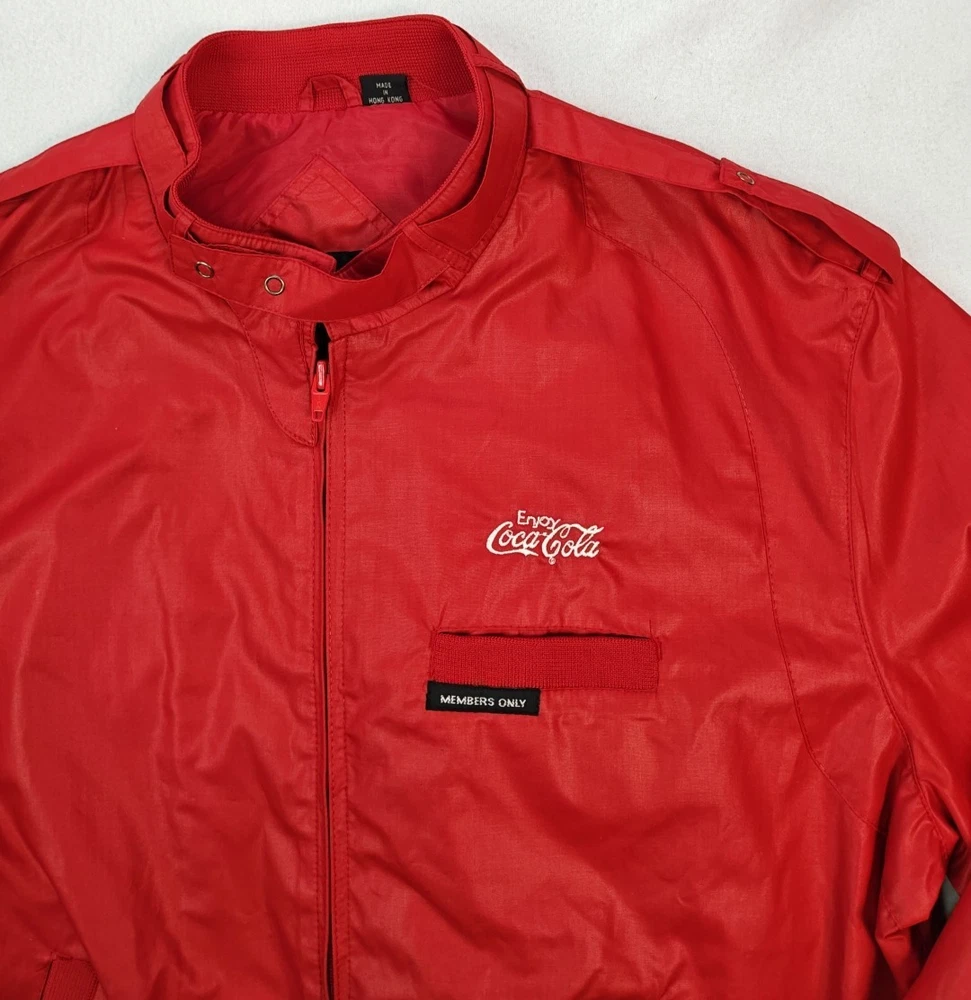 This limited edition Members Only Coca Cola satin cafe racer jacket, in size 42, is a vintage piece from the 1980s. Made from a polyester/cotton blend with a microfiber fabric type, this bomber jacket features a full zip closure, lined interior, and shoulder epaulets. Perfect for casual occasions, it is accented with the iconic Coca Cola logo and has a zip down collar style. With a retro 80s theme, this jacket is a unique addition to any man's wardrobe, offering a blend of classic style and outdoor functionality. Measurements Laid Flat : Shoulder to Hem: 25", Armpit to Armpit:24.5", Sleeve:25.5" . 100% GENUINE – U S A SELLER PLEASE NOTE: Please look at the measurements before purchasing. If you're not sure about the size, flat lay a similar item of your own and measure that item to compare with our measurements. This definitely helps in deciding if the item is the right size. Return Policy If your item does not fit, we do accept returns within 30 days . Please note, the item must be returned in the exact same condition as it was received. Buyer pays return shipping if the item does not fit. We request that you select "Item does not fit" when returning an item that does not fit. Thank you! Please see pictures for an accurate description of the item and condition. Also If you need a close up picture of something just write me a message. **Thank You for your Interest. Be sure to check out my store for more**