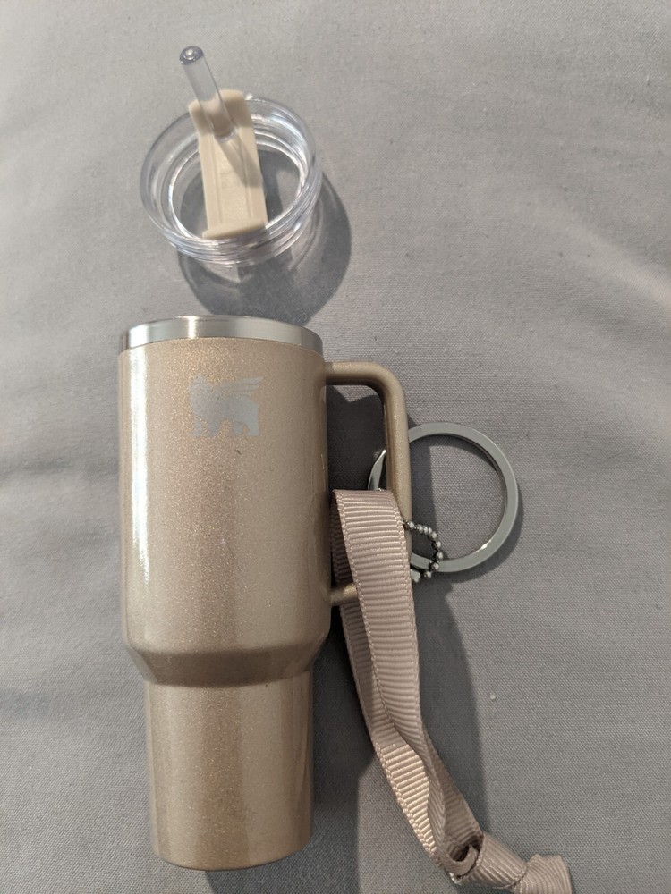 Limited Edition Stanley Mini Quencher Ornament Keychain in Honey color. Made of plastic, this keychain features a charming design suitable for collectors. It is a modern piece from the Modern era featuring a keychain attachment.