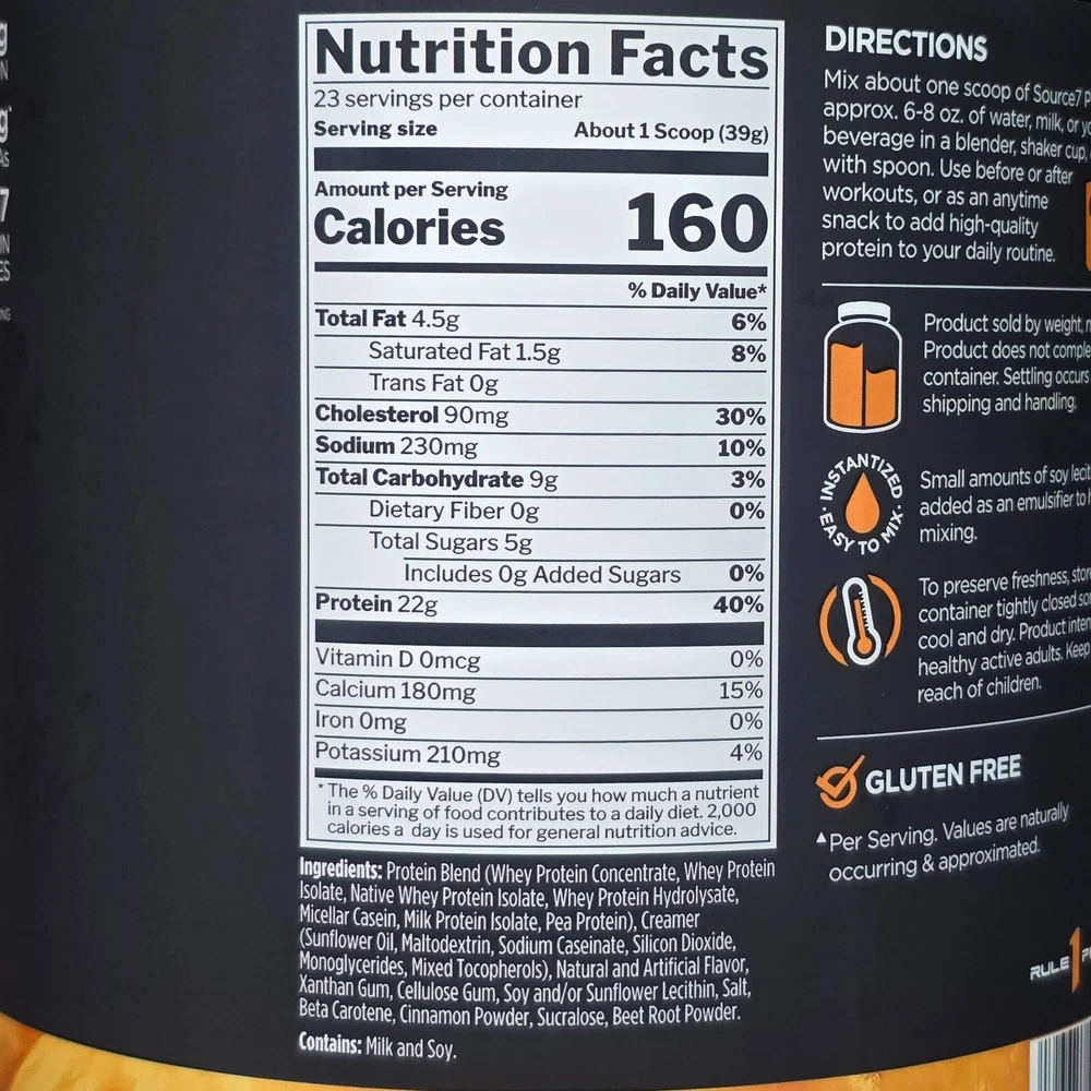 Source7 Protein brings together seven premium proteins, decadent flavor, and velvety smooth texture in an easy-to-mix shake. Its exceptionally great taste - inspired by creamy gelato - is complemented by 22g of protein from a blend of faster, moderate, and slower digesting sources.† Staged-Release Formula Made from a 22g combination of 7 different fast-acting to delayed-release protein sources, Source7 is as delicious as it is versatile.† Whey Protein Isolate Whey Protein Concentrate Hydrolyzed Whey Protein Native Whey Protein Isolate Micellar Casein Milk Protein Isolate Pea Protein Loaded w/Naturally Occurring Amino Acids Over 10g Essential Aminos (EAAs)^^† Over 7g Conditionally Essential Aminos (CEAAs)^^† Over 4g Non-Essential Aminos (NEAAs)^^† † Per serving ^^ Amino acids are naturally occurring and approximated.