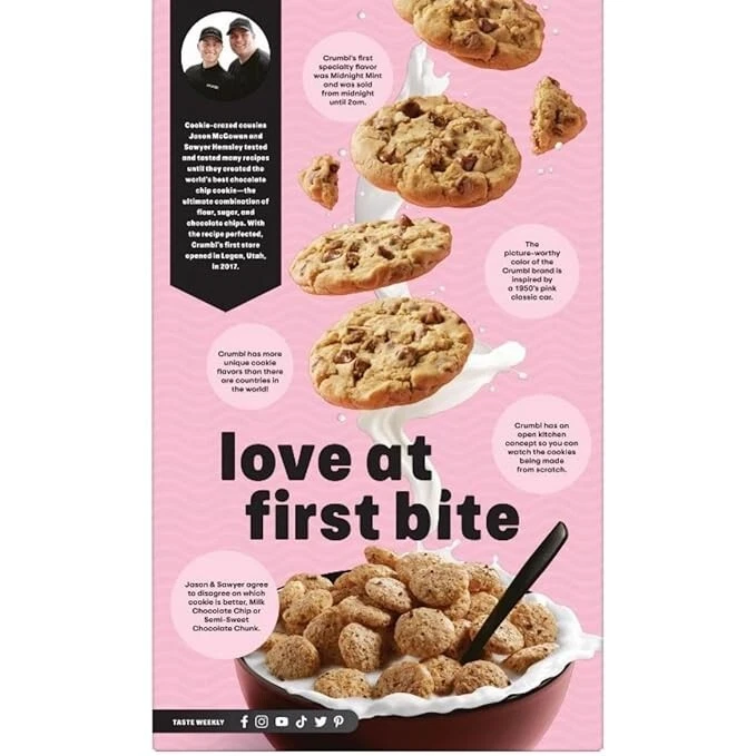 Indulge in the delicious taste of Kellogg's Crumbl Chocolatey Chip Cookie Cereal. This limited time cereal is perfect for those who love a sweet and crunchy treat. With 150 calories per serving and 1 1/2 cup serving size, this cereal is perfect for a quick and tasty breakfast. Made by Kellogg's, a trusted brand in the food industry, this cereal has a chocolatey chip cookie flavor that is sure to satisfy your taste buds. The 20.99 oz box has 15 servings, and each serving weighs 592g. This cereal is perfect for any pantry and has an expiration date of 4/25. Add this to your collection of breakfast cereals, muesli, and oats today!
