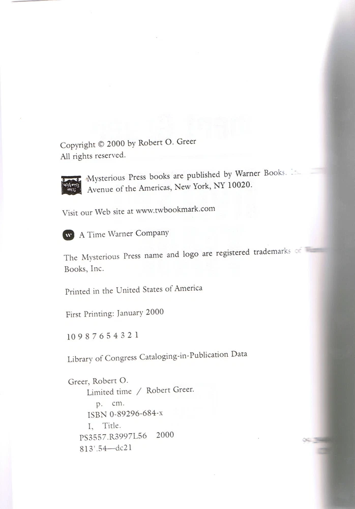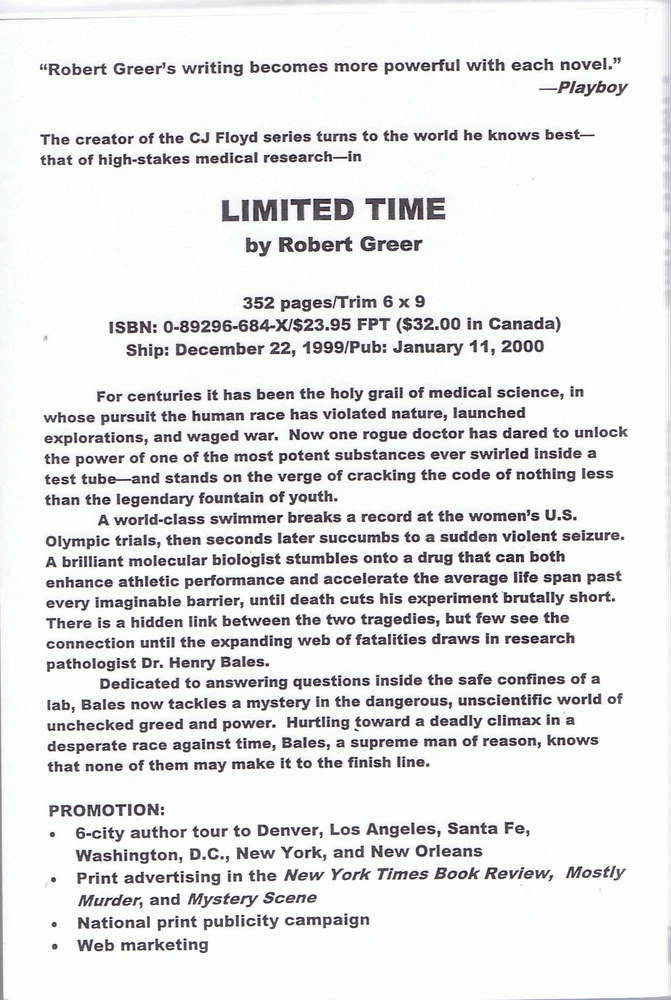 Limited Time by Robert Greer (2000, Hardcover, 1st Printing, Uncorrected Proofs) THIS BOOK IS AN ADVANCE PRINT AND FEATURES UNCORRECTED PAGE PROOFS. This means that this is a copy of the book made to be used by the publishing company for editing and correction purposes, not for public viewing. Books of this type are very rare, especially as a collector's piece. This is NOT the stock photo you see on other listings, this is the actual advance reading copy. For centuries it has been the holy grail of medical science, in whose pursuit the human race has violated nature, launched explorations, and waged war. Now one rogue doctor has dared to unlock the power of one of the most potent substances ever swirled inside a test tube -- and stands on the verge of cracking the code of nothing less than the legendary fountain of youth. A world-class swimmer breaks a record at the women's U.S. Olympic trials, then seconds later succumbs to a sudden violent seizure. A brilliant molecular biologist stumbles onto a drug that can both enhance athletic performance and accelerate the average life span past every imaginable barrier, until death cuts his experiment brutally short. There is a hidden link between the two tragedies, but few see the connection until the expanding web of fatalities draws in research pathologist Dr. Henry Bales. Dedicated to answering questions inside the safe confines of a lab, Bales now tackles a mystery in the dangerous, unscientific world of unchecked greed and power. Hurtling toward a deadly climax in a desperate race against time, Bales, a supreme man of reason, knows that none of them may make it to the finish line. If you're looking for more mystery titles, or simply browsing through unrelated items, feel free to check our other listings. You can also subscribe to our newsletter for advance notice of newly-listed products and discounts! We show you the real products we're selling on our store, rather than using simple stock photos, because we want you to know what kind of product you're buying and the quality of said product before you purchase it. You shouldn't have to suffer because an item didn't look as nice as promised. You deserve to have a quality product just like everyone else. International Buyers – Please Note: Import duties, taxes, and charges are not included in the item price or shipping cost. These charges are the buyer's responsibility. Please check with your country's customs office to determine what these additional costs will be prior to bidding or buying. Does a 4-Star rating sound like a bad thing to you? It does to eBay, so if you're happy with the product we sent you, let eBay know it and give us 5-Stars! We take every pain to make your buying experience a satisfying one, and your feedback supports us every step of the way! Please be advised that eBay's prefilled info and item specifics are not always accurate. We are not responsible for any errors in their info and ask that you only make your decision to purchase based on our description only. If you have any questions or concerns about the item please contact us before purchase.