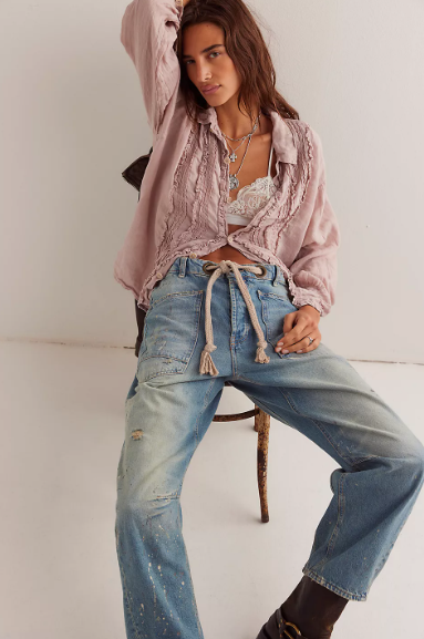 These jeans are a game-changer! The slouchy fit and tapered silhouette are so flattering, while the distressed details and paint splatter give them a unique edge. The pull-on style makes them super easy to wear, and the oversized pockets add a cool, functional touch. Love the contrast drawstring waist—it’s the perfect mix of comfort and style. Instantly elevates any outfit with minimal effort. A must-have for anyone who loves statement denim!