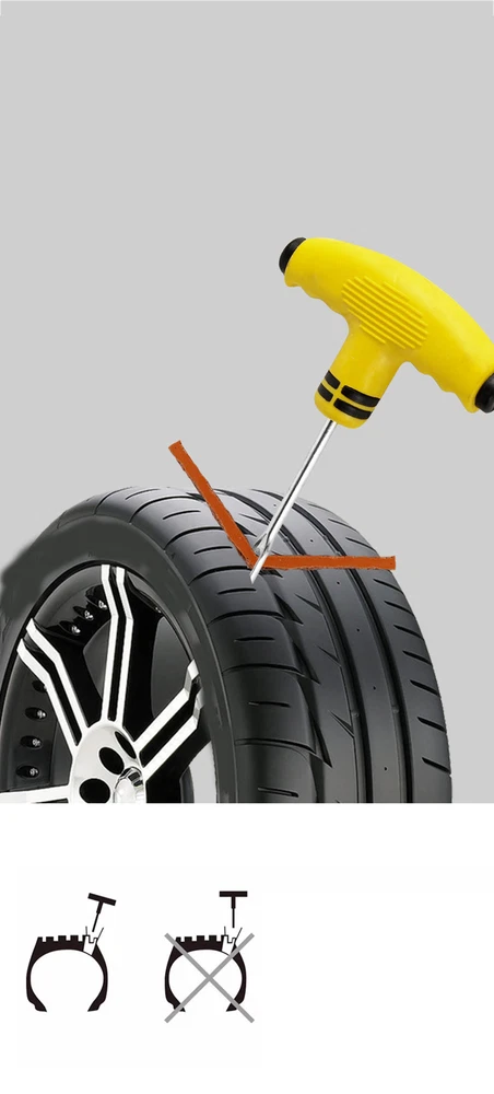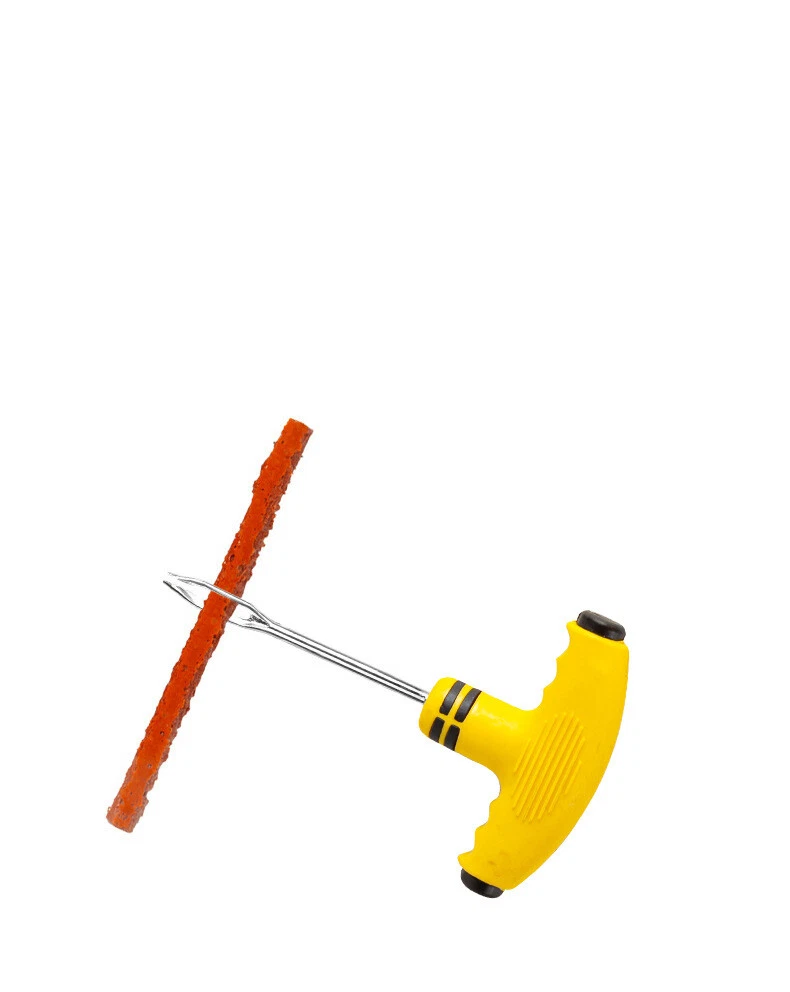 Description: Item size: 13*8.5CM Material: Rubber、 Stainless Steel Color: Yellow Contents. 1*Rasper Tool 1*Needle Tool 2*Rubber Gloves 5*Repair Strips 1*Storage Box 1*Pliers 1*Knife Rasper Tool: Clockwise rotating thread design, easy to penetrate the tire and clear the debris inside the tire. Needle Tool: Made of high strength steel, no rust, good toughness. Rubber handle is comfortable and durable. Repair Strips: made of butyl rubber and natural rubber vulcanization, not easy to aging and hardening, good air tightness. Rubber Solution: If you find a little air leakage after tire repair, you can use the tire repair glue to fill and bond. Description: Item size: 13*8.5CM Material: Rubber、 Stainless Steel Color: Yellow Contents. 1*Rasper Tool 1*Needle Tool 2*Rubber Gloves 5*Repair Strips 1*Storage Box 1*Pliers 1*Knife Rasper Tool: Clockwise rotating thread design, easy to penetrate the tire and clear the debris inside the tire. Needle Tool: Made of high strength steel, no rust, good toughness. Rubber handle is comfortable and durable. Repair Strips: made of butyl rubber and natural rubber vulcanization, not easy to aging and hardening, good air tightness. Rubber Solution: If you find a little air leakage after tire repair, you can use the tire repair glue to fill and bond. Instructions for use: 1.Mark the location of the tire to be repaired with a circle and pull out the puncture. 2. Probe the direction of the hole with a tire repair probe and insert it clockwise to clean up the dust in the hole. 3. Cut one end of the tape into a beveled opening and pass it into the eyelet at the front of the needle insertion tool, so that the length of the tape at both ends of the eyelet is basically the same. 4. Insert the needle with the rubber strip into the tire along the broken hole, make sure the rubber strip is inserted into 2/3 of the length, and rotate the needle 360 degrees and pull out the needle. 5. Cut off the rubber strip outside the tire.