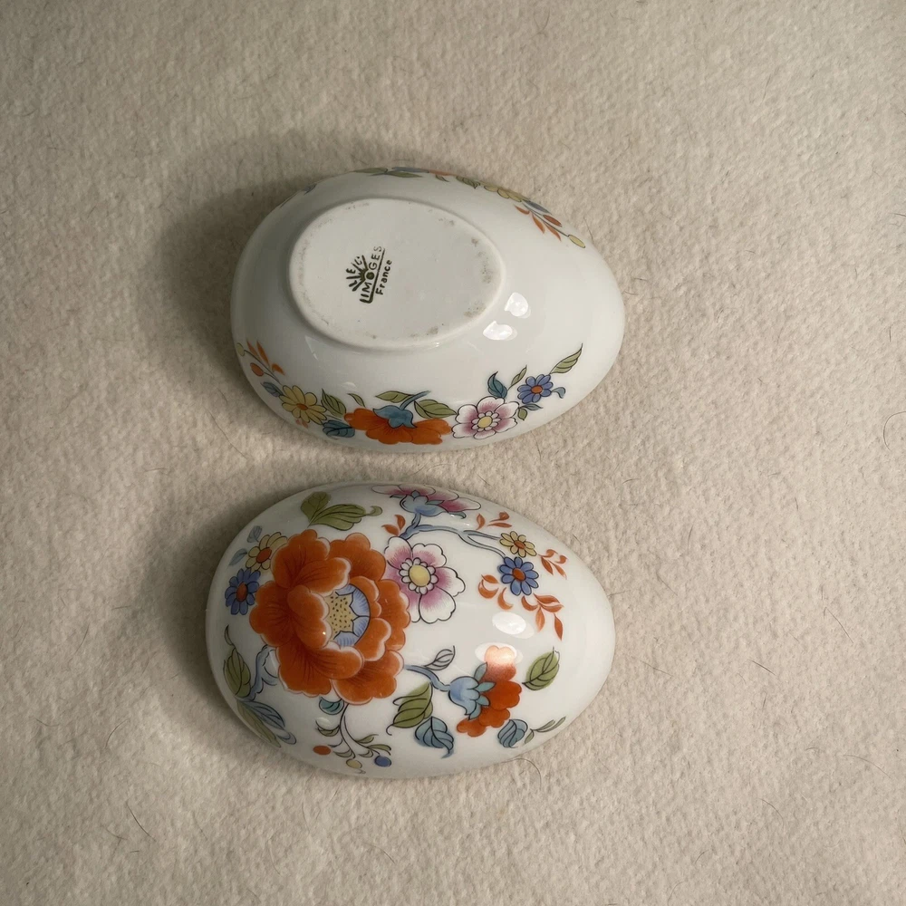 This Limoges France Porcelain Egg Shaped Trinket Box features a beautiful hand-painted floral design, making it a charming decorative piece for all occasions. The oval-shaped box is crafted from high-quality porcelain with a glossy finish, showcasing intricate French style. Measuring 4.5 inches in length, 3 inches in height, and 3 inches in width, this original 1980s piece from France is a unique collectible item that weighs 6.5 ounces. Excellent condition. No chips or cracks.