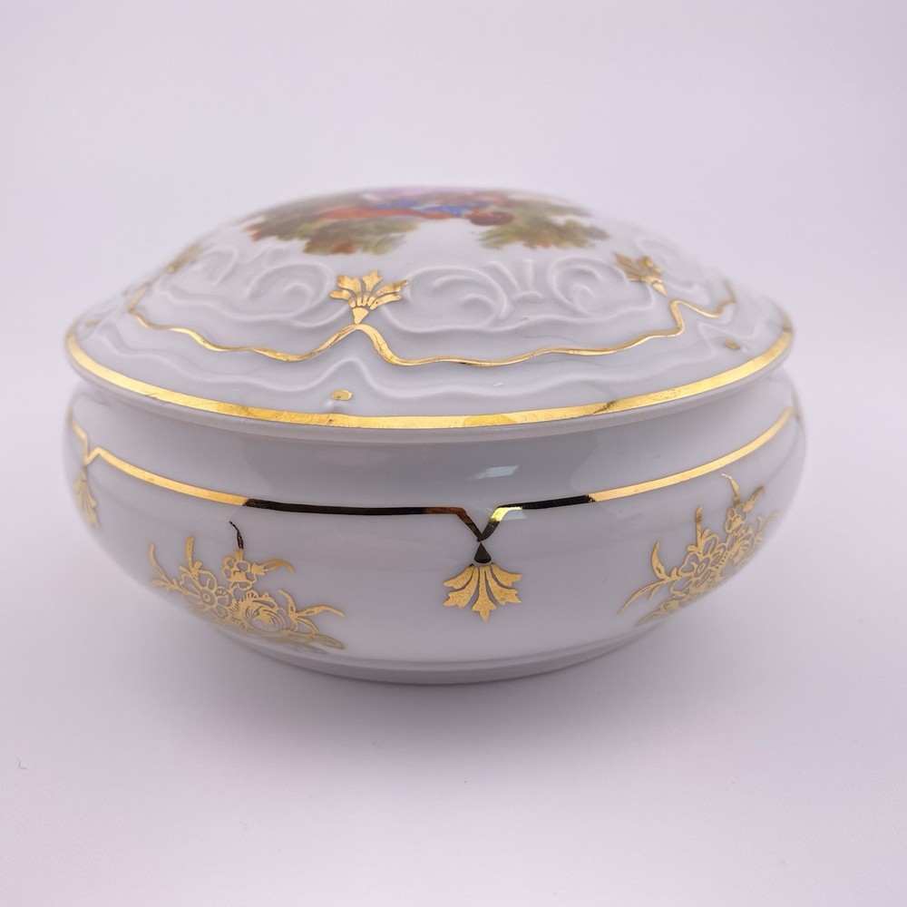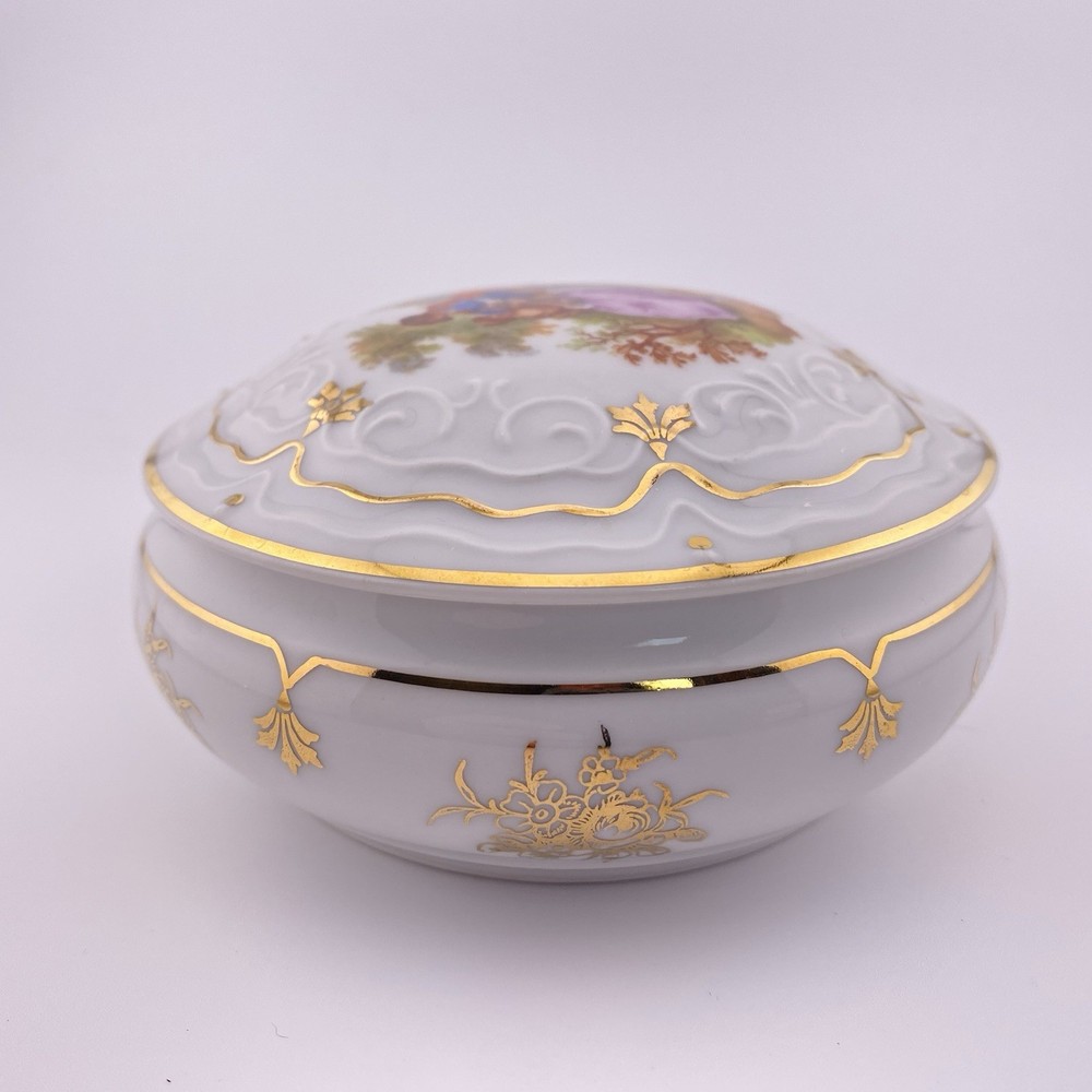 RARE COURTING COUPLE By LIMOGES Beautiful, hard to find, hand painted porcelain vanity/trinket box in excellent condition. White with 22k gold accents and trim. Please review all photos for quality. Some wear on gold trim as to be expected for its age. Dimensions: 2.5" x 4.5" x 4.5" Please send a message if you would like more detailed pictures or have any questions at all regarding this item or others I have posted. Shipping from smoke free home Absolutely Beautiful!!!
