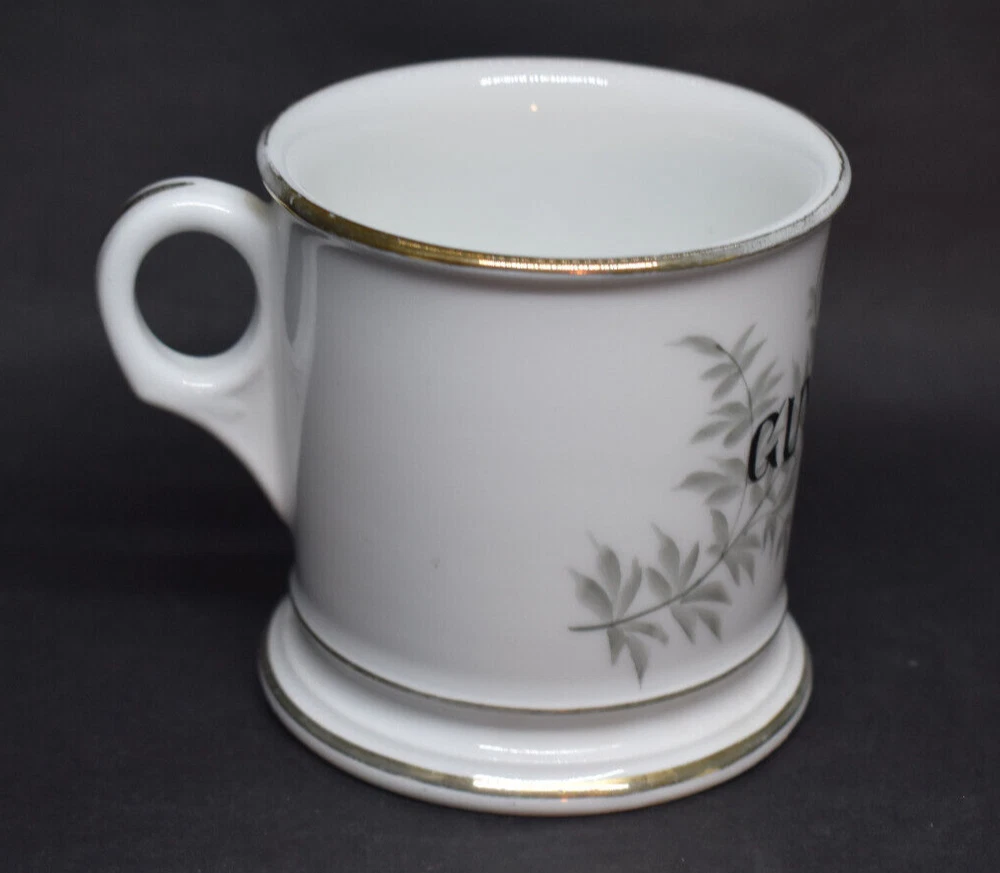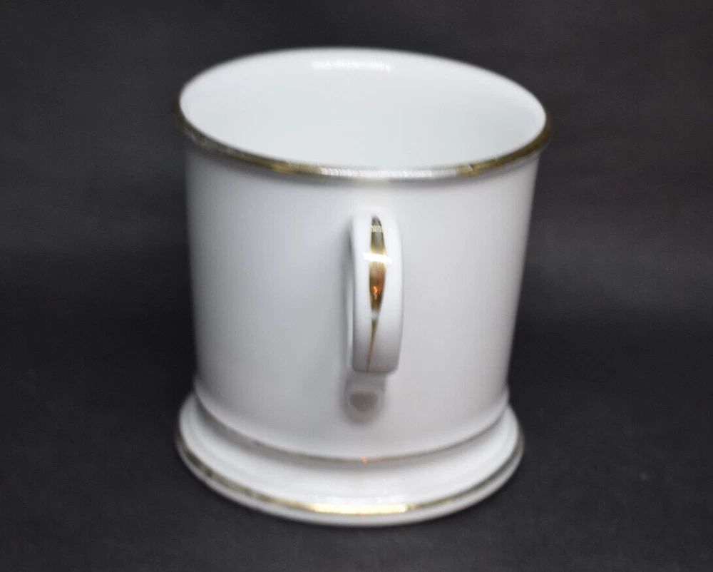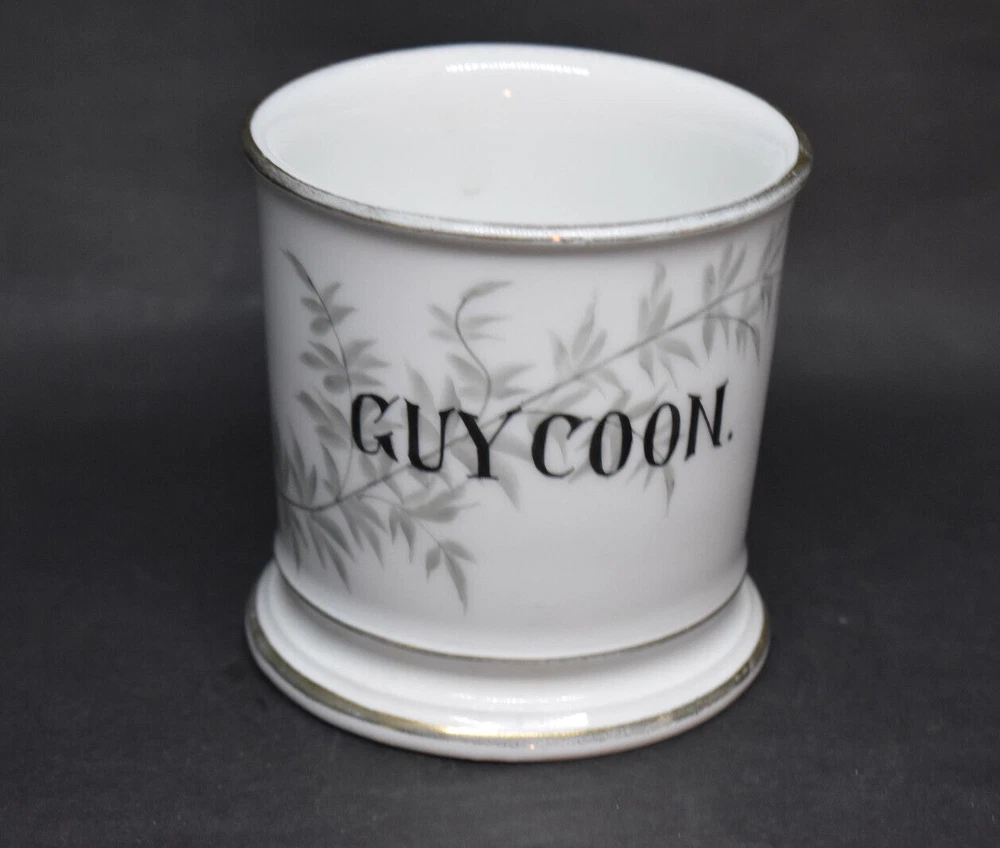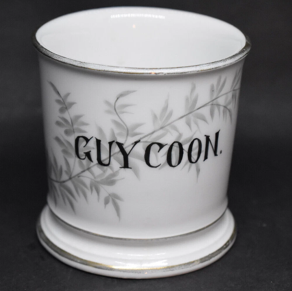 This porcelain shaving mug measures approximately 3 5/8" tall and 3 5/8" wide at the top, not including the handle. This was made by Tressemanes & Vogt of Limoges, France, between 1892 and 1917. It has gray leaves and branches with the name Guy Coon in black. This was likely given as a gift to this man named Guy Coon over 100 years ago. It is in very good condition with no chips or cracks. There are wear and surface marks on the base. There is some wear to the gold trim and accents. Please see my pictures, and thanks for looking! Fragile items are packaged securely and with care.