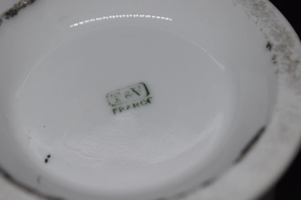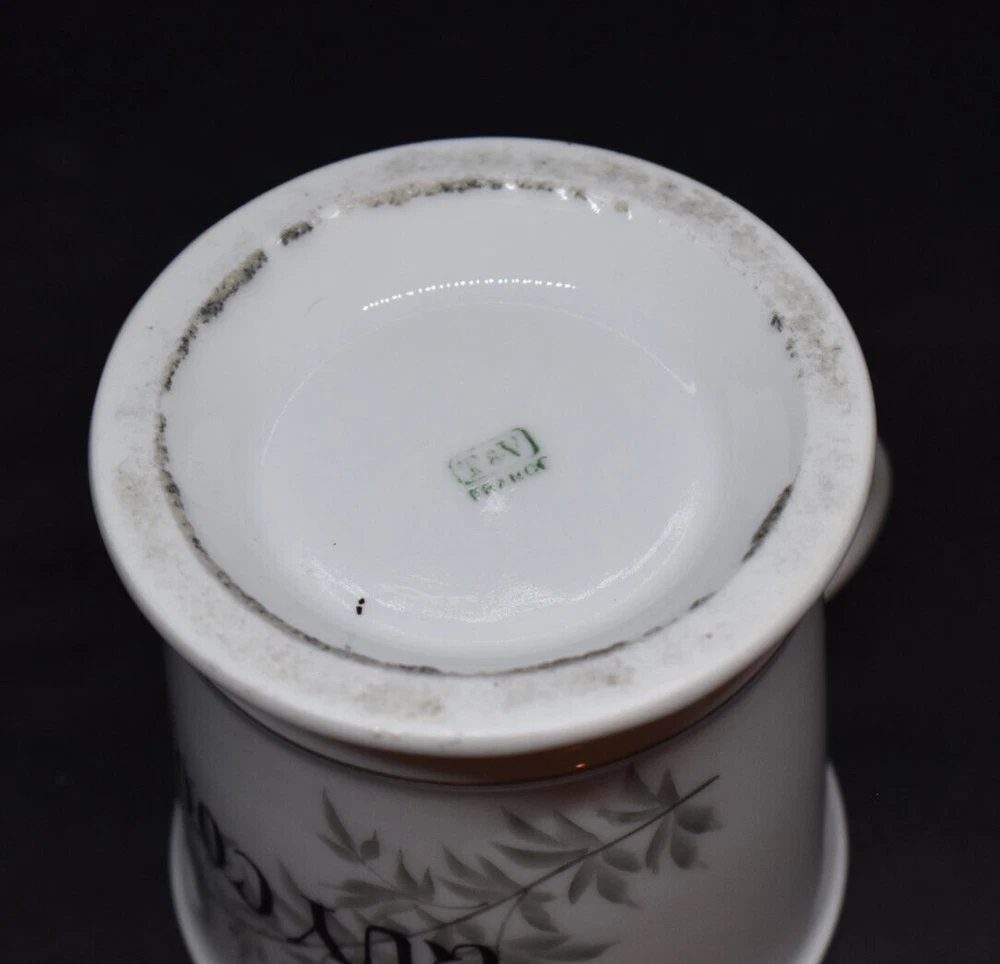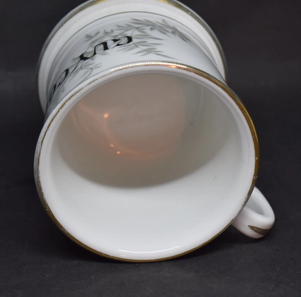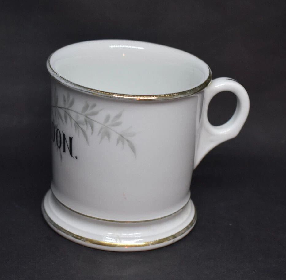 This porcelain shaving mug measures approximately 3 5/8" tall and 3 5/8" wide at the top, not including the handle. This was made by Tressemanes & Vogt of Limoges, France, between 1892 and 1917. It has gray leaves and branches with the name Guy Coon in black. This was likely given as a gift to this man named Guy Coon over 100 years ago. It is in very good condition with no chips or cracks. There are wear and surface marks on the base. There is some wear to the gold trim and accents. Please see my pictures, and thanks for looking! Fragile items are packaged securely and with care.