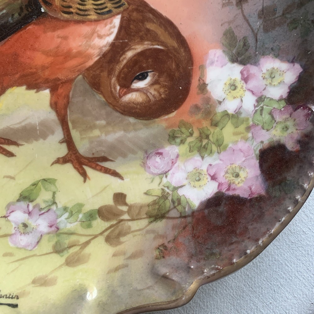 This beautiful Limoges wall charger is a stunning piece of decorative art that will enhance any room. The charger features a pair of quails and is artist signed, making it a unique addition to any collection. The round shape and multicolor design are perfect for all occasions, and the 10.5 inch diameter makes it a statement piece. Made in France between 1900-1919, this antique charger is handmade and part of the Game Birds product line. It is a vintage item that adds a touch of French culture to any decor. This Limoges charger is perfect for collectors and those who appreciate decorative art. Please see all photos for the best description. No cracks or chips. Signed on bottom as shown. Please ask any and all questions.