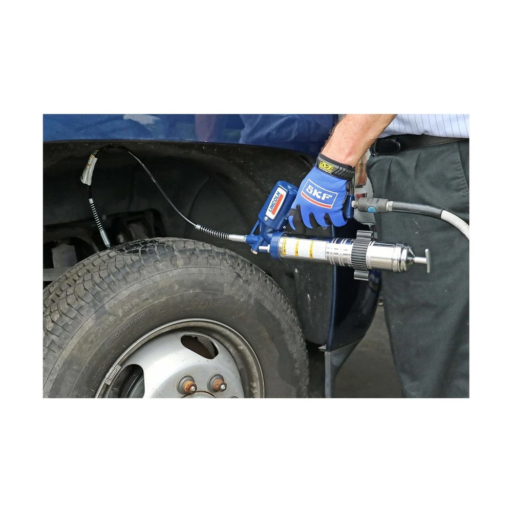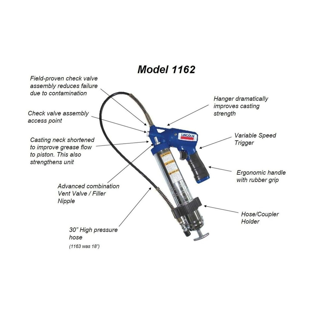 Lincoln 1162 Pneumatic Grease Gun with 30" High-Pressure Hose and Coupler, Variable Speed Trigger, 6,000 PSI, Fully Automatic, Continuous Operation, Combination Filler Coupler Air Bleeder Valve Description The Lincoln 1162 Pneumatic Grease Gun is a high-performance tool designed for professionals requiring efficient lubrication. With up to 6,000 PSI output, it delivers powerful, high-pressure lubrication for cars, trucks, industrial machinery, and agricultural equipment. Its variable speed trigger allows precise control of grease flow, while the fully automatic, continuous operation is perfect for high-volume tasks. A 30-inch high-pressure hose with a coupler reaches tight areas like CV joints and suspension systems. Built for durability, it includes a combination filler coupler and air bleeder valve for easy refilling and purging. Trusted by professionals, the Lincoln 1162 ensures smooth operation and extends equipment life. Features: HIGH-PRESSURE PERFORMANCE: The Lincoln 1162 Pneumatic Grease Gun delivers up to 6,000 PSI, ensuring effective lubrication for automotive, industrial, and agricultural equipment. Ideal for high-pressure applications like CV joints, bearings, and zerk fittings VARIABLE SPEED TRIGGER: Equipped with a variable speed trigger, this fully automatic grease gun provides precise control over grease flow, allowing for continuous operation and efficient lubrication in any setting DURABLE 30-INCH HOSE AND COUPLER: The 30-inch high-pressure hose with coupler makes it easy to reach tight spots and hard-to-access areas, making it perfect for lubricating suspension systems, gears, and machinery CONTINUOUS OPERATION: Designed for continuous use, the Lincoln 1162 ensures that you can complete even the most demanding maintenance tasks without interruption. The combination filler coupler and air bleeder valve add convenience and efficiency VERSATILE APPLICATION: Ideal for automotive, industrial, and marine environments, this pneumatic grease gun is perfect for reducing friction and wear on a wide range of equipment, from cars and trucks to tractors, cranes, and boats Product Details: Manufacturer: Lincoln Brand: Lincoln Model: 1162 Item Weight: 5.6 pounds Product Dimensions: 17.25 x 7.5 x 3 inches Item model number: 1162 Is Discontinued By Manufacturer: No Manufacturer Part Number: 1162 Date First Available: March 10, 2008 Delivery We Do Not Ship Outside of the Continental US. Return Policy All items qualify for returns within 30 days of receipt. Seller is responsible for return shipping on any item that is not damaged. Feedback We take our reputation seriously, we buy and sell online, so we understand the value of trust. If you are unsatisfied with your order, please contact us and we will work with you to resolve it to your satisfaction.