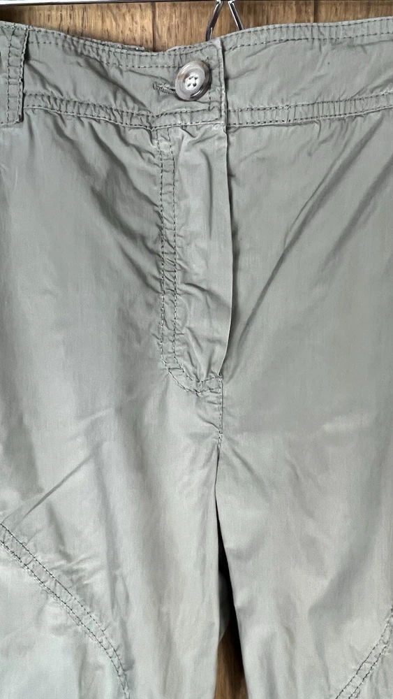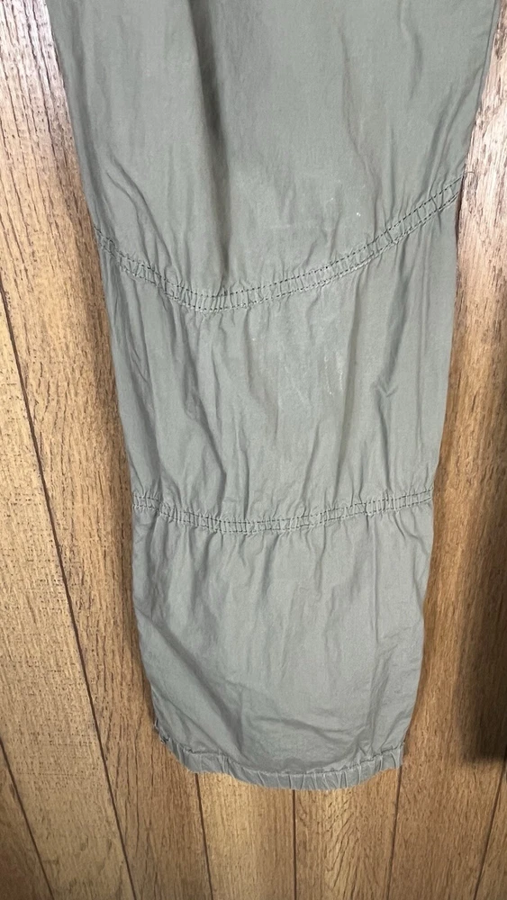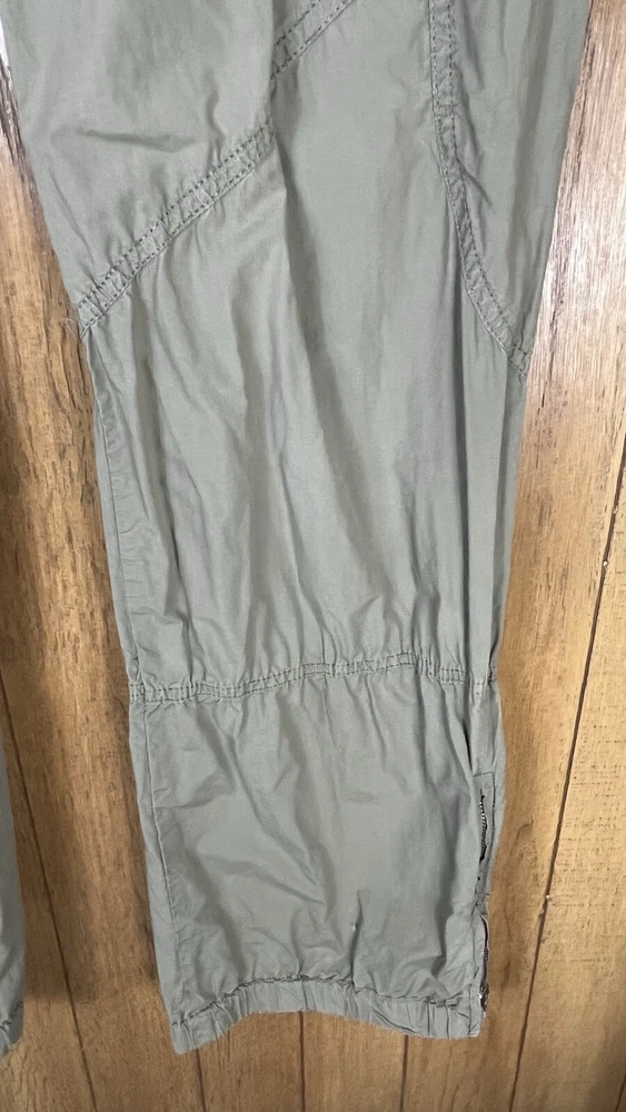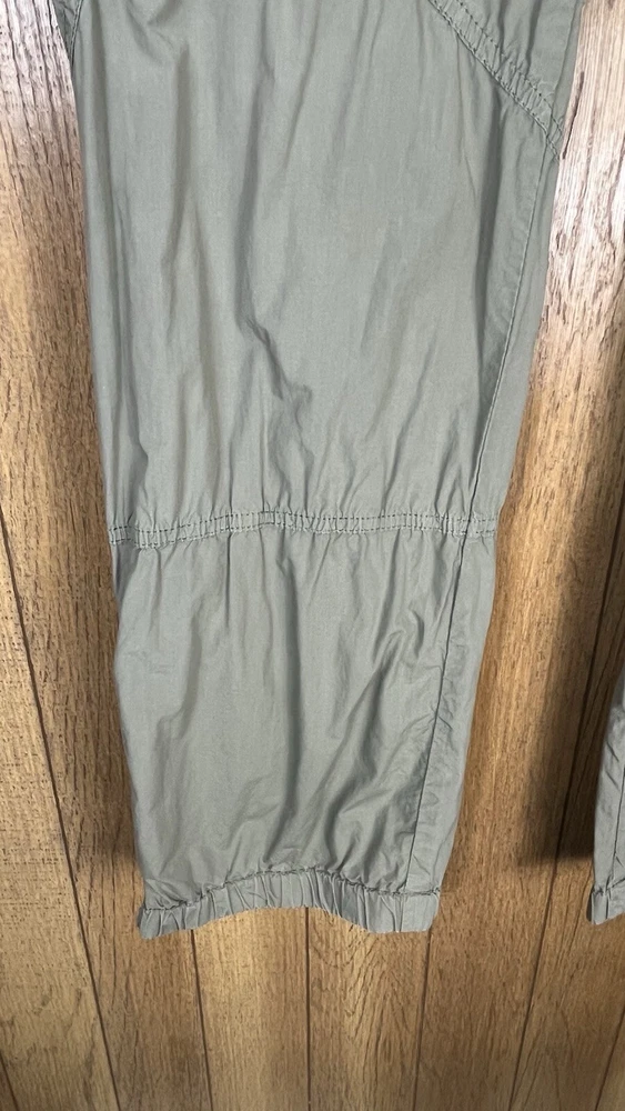 Flaw - there are 2 small bleach spots on the left back thigh, crotch needs a few stitches on the sewing machine These Lineaemme jogger leg pants in size 10 feature a solid green color and are made of 100% cotton canvas fabric. They have a 34" waist size and an 11" rise, with a comfortable regular fit and elastic ankles. The pants are designed with cargo pockets for added convenience while hiking or exploring the outdoors, enhanced by button and zipper accents. The nature, rock, outdoors, and retro theme combined with machine washable care instructions make these pants a versatile choice for all seasons.