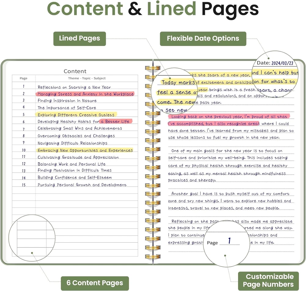 Sturdy Construction: Our Lined Spiral Journal Notebook is built to last with a sturdy metal twin-wire binding and a tough hardcover. The water-resistant cover shields your notes from damage, while the double-wire design allows for easy folding and flat laying. High-Quality Paper: Crafted from 100 GSM thick, ink-friendly paper, our notebook prevents ink bleed-through and ghosting. It accommodates various pens, including ballpoint, gel, and fountain pens. Each page features a day header for effortless date tracking. Organized and Functional Design: With 140 lined pages and a 6-page blank table of contents, our notebook offers ample space for note-taking and easy referencing. An inner pocket keeps miscellaneous items secure, and an elastic closure band ensures the notebook stays closed when not in use. Versatile Usage: Suitable for office, school, and home environments, our notebook is perfect for journaling, note-taking, drawing, goal setting, Bible, and planning. It's a thoughtful present for friends, family, classmates, and colleagues. Medium-Sized Portability: Measuring 6 inches x 8 inches, our medium notebook strikes the perfect balance between portability and functionality. Its sturdy construction and aesthetic design make it an ideal companion for all your writing endeavors. Product Description 1 For Bible 2 For Fitness 3 For Finances 4 For Message Taja's Planner, Journal & Calendar Add to Cart Add to Cart Add to Cart Add to Cart Add to Cart Add to Cart Add to Cart Customer Reviews 4.7 out of 5 stars 36 4.9 out of 5 stars 27 4.6 out of 5 stars 87 4.5 out of 5 stars 108 4.6 out of 5 stars 157 4.6 out of 5 stars 11 4.8 out of 5 stars 87 Price $5.99 $ 5 . 99 $7.99 $ 7 . 99 $5.99 $ 5 . 99 $5.99 $ 5 . 99 $5.99 $ 5 . 99 $6.99 $ 6 . 99 $9.99 $ 9 . 99 Size 5.7" x 8.6" A5 or B5 7" x 10" 6.5" x 3.5" 8.3" x11.7" 14.7" x 11.5" 5.3" x 8.2" Feature Hardcover Hard Cover Spiral Binding Staple Bound Spiral Binding Spiral Binding Hardcover Color Multicolor Multicolor Multicolor Forest/Purple/Navy Abstract Floral Festive Pattern Multicolor Quantity 160 Pages / 80 Sheets 240 Pages / 120 Sheets 74 Pages / 37 Sheets 64 Pages / 32 Sheets 18 Months 18 Months 182 Pages / 91 Sheets Usage Scenario Office School & Home Supplies Office & Home & School Office School & Home Supplies Office School & Home Supplies Home & Office Supplies Home & Office Supplies Office School & Home Supplies