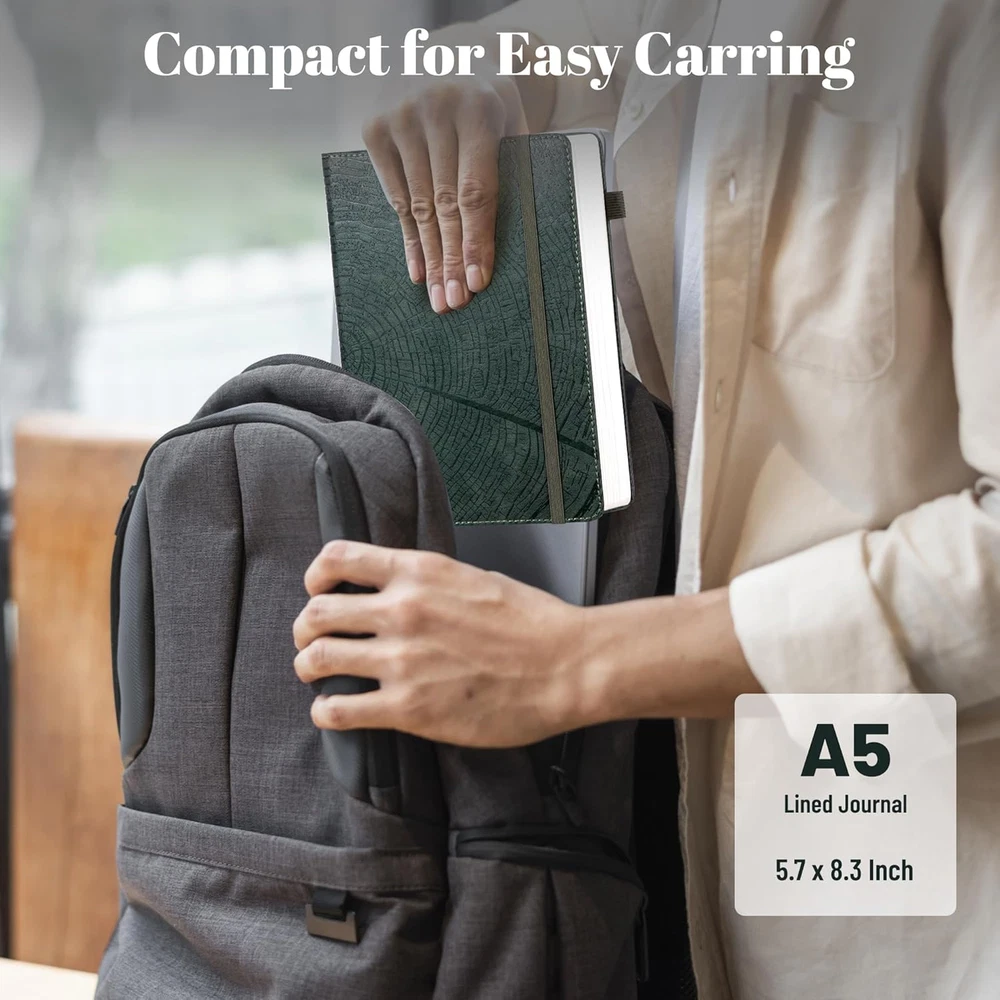 VEGAN LEATHER BOUND JOURNAL: Tree growth ring embossed with a cruelty-free vegan leather cover, the tree growth ring symbolises each person has grown up and the achievements and challenges. 5.7 x 8.3 inches, compact and easy to carry. PREMIUM QUALITY PAPER: Leather bound journal features 100 gsm 256 pages of premium acid-free paper that prevents ink bleed, erasures, ghosting and shadows while protecting your eyes. Hardcover notebook journal provides you with a good writing experience, So you can do a better job of writing or creatin LAY FLAT DESIGN: Our writing journal is designed to lay flat, making it easier to write with either hand, The elastic closure design helps protect your content. A ribbon bookmark inside makes it easy to keep track of queries and the pocket design for cards, receipts, or other small, scattered items, making it easy to organize your things. VERSATILE USE -- This A5 notebook is ideal for office, school and home use, and is a great gift choice for women, men, business executives, college, students and people in many other fields. This 5.7 x 8.3 inch journal can be carried around in a bag and is also a good helper for your travel records, meeting all your needs. CAGIE BRAND SUPPORT: You can purchase our products with full confidence! if you don't love the journal notebook due to any quality issues, simply directly within 1 year and we will send you a hassle-free replacement journals for wroting or full refund. Product Description