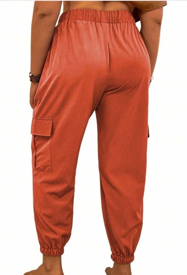 These Linen Blend Cargo Joggers in size M feature a relaxed fit with a tapered leg style. They come in a vibrant orange color with gold accents, perfect for casual or travel occasions. The pants have an elastic waist with drawstring closure, and include pockets for convenience. Made from a blend of viscose and linen, they are machine washable and suitable for all seasons.