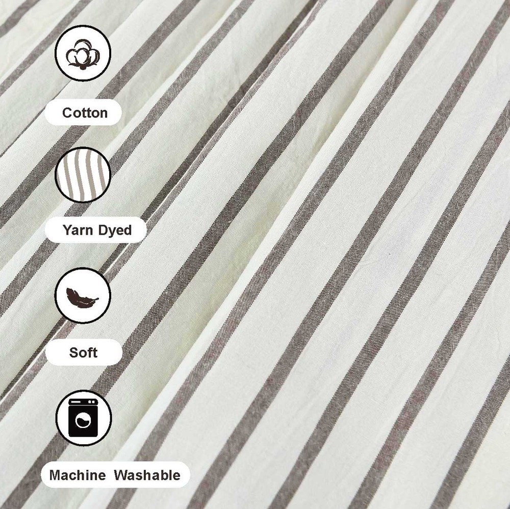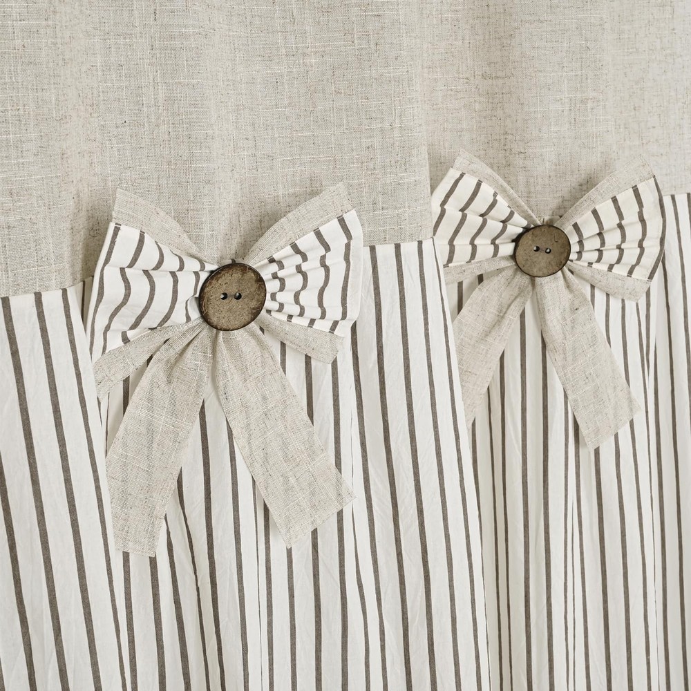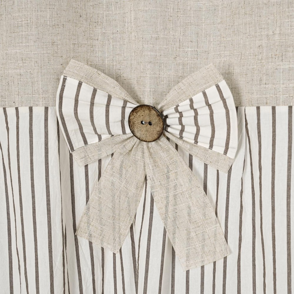 Packaging:one shower curtain(72 in x78 in),without hooks and rod. MEASURE--72 x 78 in, reinforced top header with 12 button holes for long-time using and easy installation with any ring or hook. Soft, linen and cotton blend fabric and nature wooden button curtain with a country style design for your bathroom. Simple beige and taupe stripe in a yarn dyed weave, this ticking striped bow shower curtain features a farmhouse and country style that is complimentary to your bathroom decor. Two tone shower curtain with pleats and wooden button embellishments to enhance your space.Shower curtain with striped pattern works well with many decorating style: shabby chic, French country style, modern rustic, boho and country style. Machine wash in cold water with like colors,gentle cycle.Do not bleach.Tumble dry low,remove promptly.Iron if needed.