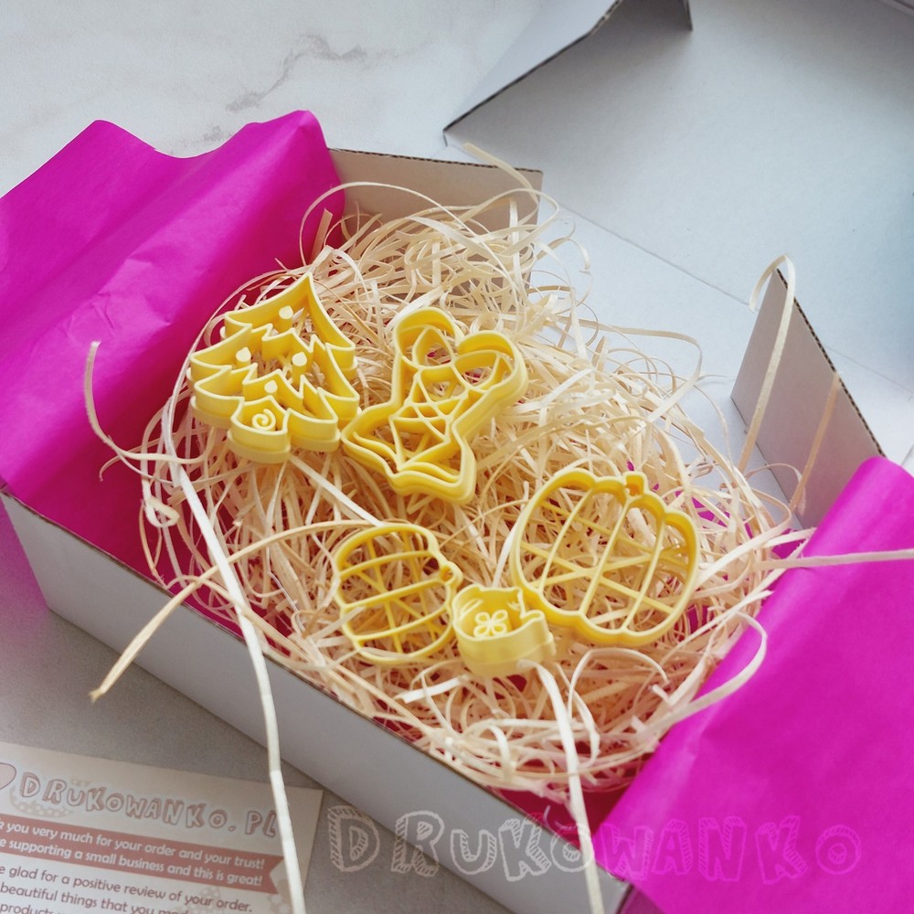 You can order each of my polymer cutter in two styles: - Regular Cutter (R e g u l a r) - Stamp + Outline (S t a m p + O u t l i n e) Please see the differences between them in the example photo. My standard sizes are - L, M and S. All sizes are shown in the second photo, on the grid. The grid is 10x10mm. You can also buy the whole set of all 3 sizes. My cutters can be used to make cookies but also to make art, cut clay, make jewelry, soap and even leather - tested possibilities are many. For imperial measurements - 1inch is 25mm If you wish to get a mirrored version, please buy two of them and let me know in the message to mirror the second one. Total wall height: 12mm Details in Regular style starts at: 3mm Details in Stamp + Outline: you decide by yourself how deep you push the details and then you can use the outline cutter (or vice versa). We make our cookie cutters with love, passion and commitment. Material used for production is food grade and fully recycable. I design them only by myself and I am able to do some custom sizes aswell as custom cookie cutters for you. Custom orders are very welcome! :) I am an artist, and my partner Rafal is a technical specialist for hardware and sales related things, so we make a great couple in bussiness and in real life :) These cookie cutters are dishwasher safe up to 50C/125F temperature max - please use only low-heart, eco programs , you can also wash them by hands and use warm water. return