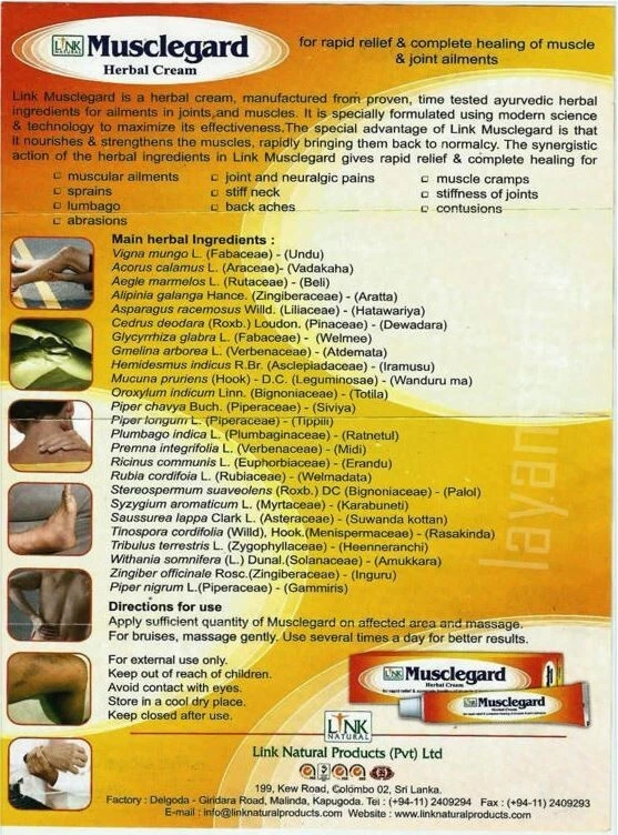 Link Musclegard Herbal Cream Rapid Relief for Backache & Muscular Pain 25G Items size - 25g Link Natural Musclegard Herbal cream for rapid relief & complete healing of muscle and joint ailments Link Musclegard is a herbal cream, manifactured from proven. time tested ayurvedic herbal ingredients for ailments in joints and muscles. It is specially formulated using modern science and technology to maximize its effectiveness. The special advantage of Link Musclegard is that it nourishes & strengthens the muscles, rapidly bringing them back to normalcy. The synergistic action of the herbal ingredients in Link Musclegard gives rapid relief & complete healing for: muscular ailments sprains lumbago abrasions joint and neuralgic pains stiff neck back aches knee pains muscle cramps stiffness of joints contusions This combination of extracts from twenty five main plant species has rubefacient and mild local anaesthetic activity. The plants used in Link Musclegard have been recognised in the traditional pharmacopoeias as effective in reducing stiffness in joints, arthritic and rheumatic conditions and lumbago. Modern scientific studies have shown some of them to have smooth muscle relaxant, anti – inflammatory and analgesic activity. Main herbal Ingredients: Acorus calamus L.(Araceae) Aegle marmelos L.(Rutaceae) Alipinia galanga Hance.(Rubiaceae) Alysicarpus vaginalis (L.)DC(Leguminosae) Cedrus deodara (Roxb.)Loudon. (Pinaceae) Glycyrrhiza glabra L.(Fabaceae) Gmelina arborea L.(Verbenaceae) Hemidesmus indicus R.Br.(Asclepiadaceae) Mucuna prurens (Hook) D.C.(Leguminosae) Oroxylum indicum Linn.(Bignoniaceae) Vigna mungo L.(Fabaceae) Piper chaba Hunter.(Piperaceae) Piper longum L.(Piperaceae) Piper nigrum L.(Piperaceae) Plumbago indica L.(Plumbaginaceae) Premna integrifolia L.(Verbenaceae) Ricinus communis L.(Euphorbiaceae) Rubia cordifolia L.(Rubiaceae) Stereospermum suaveolens (Roxb.) Syzygium aromaticum L. (Myrtaceae) Saussurea lappa Clark.(Asteraceae) Tinospora cordifolia(Willd),Hook.(Menispermaceae) Tribulus terrestris L.(Zygophyllaceae) Withania somnifera (L.)Dunal.(Solanaceae) Zingiber officinale Rosc.(Zingiberaceae) Shipping Information: Shipping by Sri Lankan Register Post air mail. Free Shipping Worldwide. Your purchased item will be shipped to the address listed in your eBay account. Ensure that your shipping address and zip code are accurate and current. The package will be dispatched directly from Sri Lanka. Orders will be processed within 5 days of cleared payment. Expect delivery within 15-45 days, varying based on the destination country, customs clearance procedures, and holidays. Rest assured, all items will undergo thorough inspection and secure packaging before being sent out. Import duties, taxes, and charges are not integrated into the item price or shipping fees. Buyers are responsible for these additional costs. Prior to bidding or buying, we recommend checking with your country's customs office to determine the potential extra expenses. ***************************************************** FEEDBACK We deeply value your satisfaction and strive to provide you with the best shopping experience. Your feedback is incredibly important to us as it helps us understand your needs better and improve our services . CONTACT US "Got questions or concerns? We're here to help! Our dedicated customer support team is ready to assist you with anything related to your purchase. Whether you're seeking product information, tracking details, or assistance with returns, feel free to reach out. Your satisfaction is our priority, and we're committed to providing a seamless shopping experience. Contact us with confidence, and let us enhance your eBay shopping journey!"