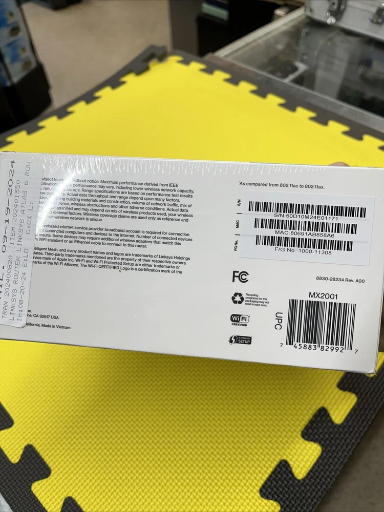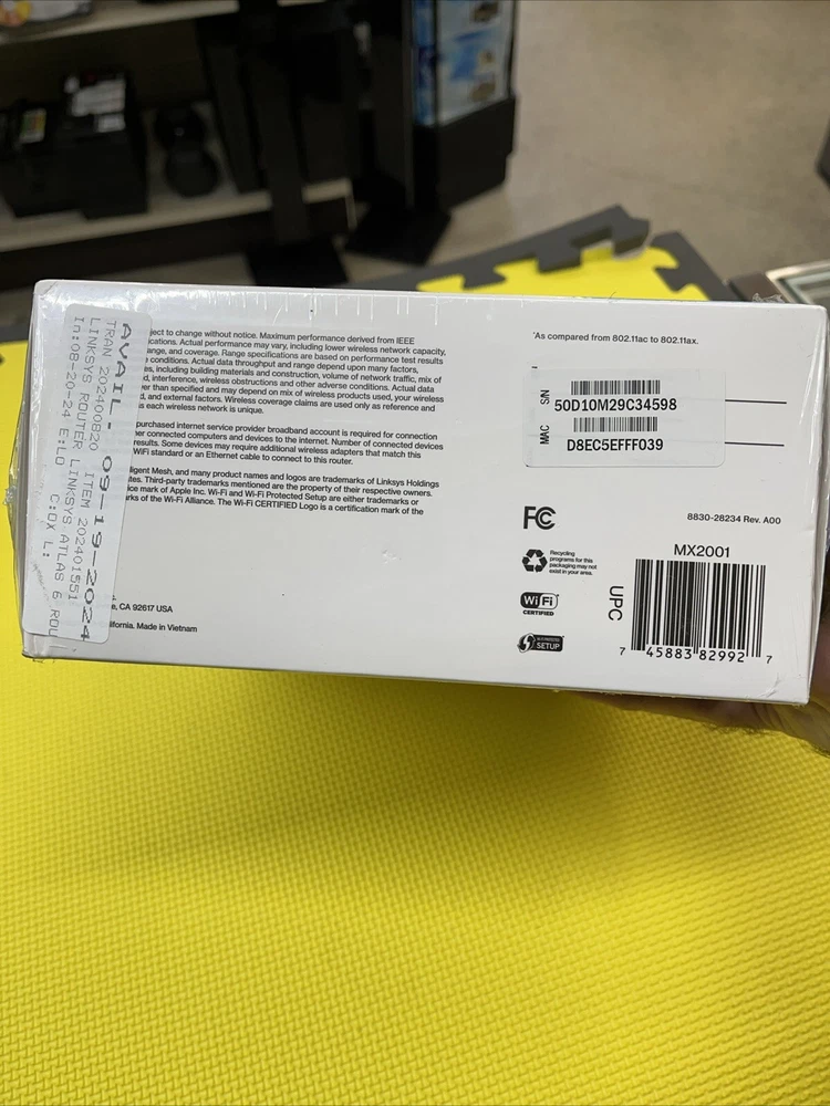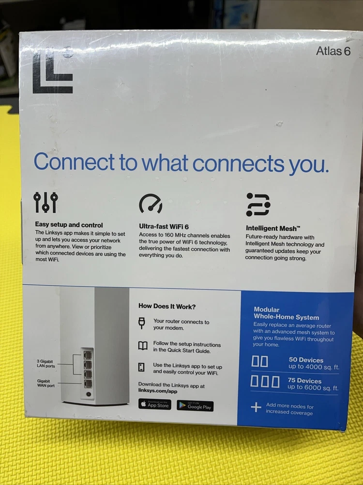 gtin13:0745883829927MPN:MX2001Number of LAN Ports:3Item Length:8 1/4"Maximum LAN Data Rate:1000 MbpsConnectivity:Wireless-Wi-Fi 802.11ax, Wired-Ethernet (RJ-45)Model:Linksys Atlas 6Item Width:9.5"Brand:LinksysCountry/Region of Manufacture:VietnamPorts:Ethernet (RJ-45)Type:RouterTo Fit:PCColor:WhiteItem Height:4"Maximum Wireless Data Rate:1200 MbpsFeatures:Dual-BandUPC:0745883829927
