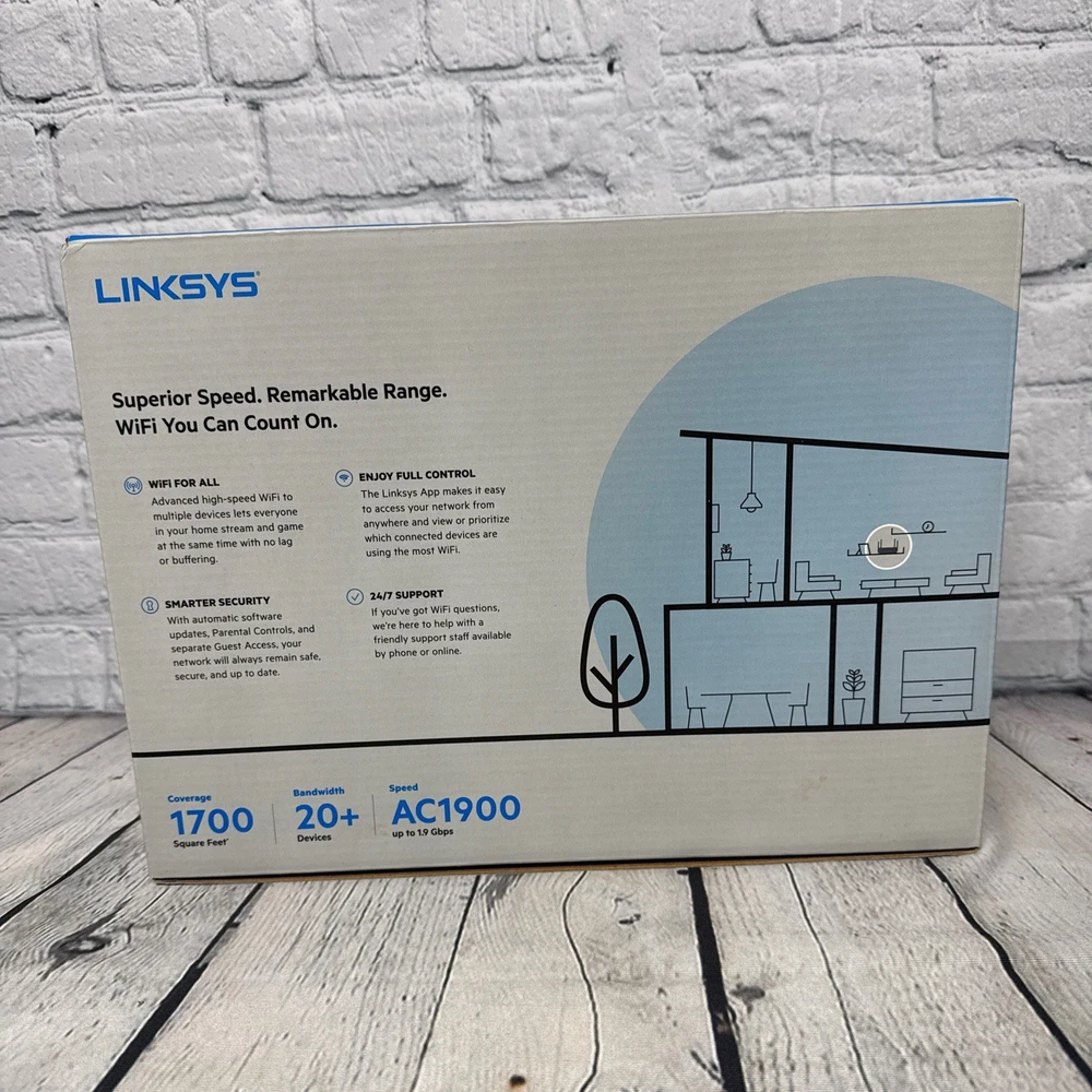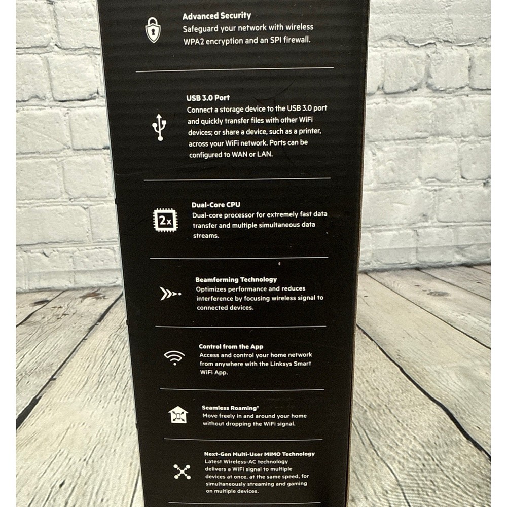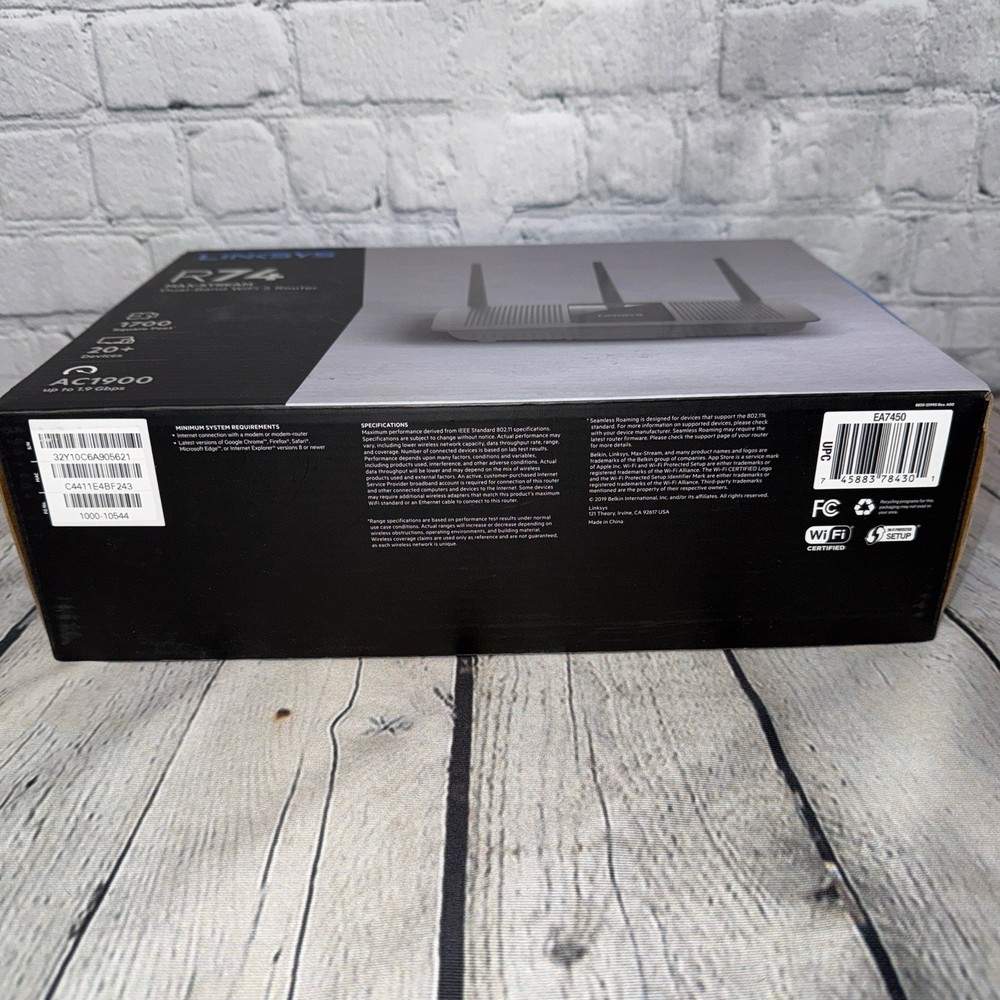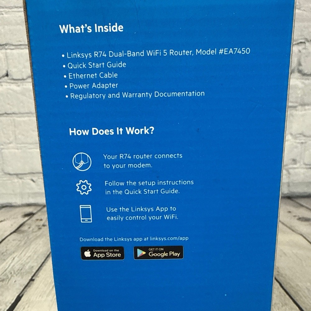 NEW! Linksys R74 Max-Stream Dual Band WiFi 5 router. Features: Web browser setup Set up using your laptop, computer, smartphone, or tablet. No CD required. Up to 1.9 Gbps data transfer speed Ensures fast, efficient operation. 3 high-performance antennas Enable enhanced performance. MU-MIMO technology MU-MIMO gives every compatible device its own dedicated full-speed Wi-Fi connection so that multiple devices can connect at the same time without slowing down the network. 1 USB 3.0 port Allows you to connect a printer and enjoy 3G and 4G file sharing. Parental control Lets you automatically block specific content on connected devices. Seamless roaming Move freely in and around your home without dropping the Wi-Fi signal. Gigabit Ethernet connectivity Offers a high-speed wired network connection. Linksys Smart Wi-Fi Access and control your home network from anywhere with the Linksys Smart Wi-Fi. App LED indicators Make it easy to monitor the status of your network. Advanced security Safeguard your network with wireless WPA2 encryption and an SPI firewall. Beamforming technology Optimizes performance and reduces interference by focusing a wireless signal to connected devices. PC system requirements Microsoft Windows 7, 8, or 10. New in box!