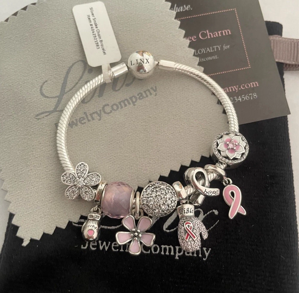 Linx snake chain style charm bracelet in 925 sterling silver, with a ball clasp, featuring the signature Linx logo. This beautiful bracelet features 9 Linx charms also in 925 Sterling silver. Size 7.5 Bracelet is also available in sizes 6.3 (toddler size), 6.7, 7.1, 7.9, and 8.3. Should you require one of these sizes, please message us prior to purchasing and we will create a listing for you in your requested size. Please remember to add an additional inch to the measurement of your wrist in order to allow room for your charms, as the charms will cause the bracelet to fit a bit tighter. Bracelet is new with tags and will also come with the original Linx velvet jewelry pouch, and Linx sterling silver polishing cloth.