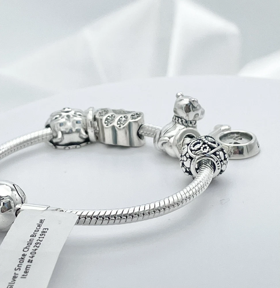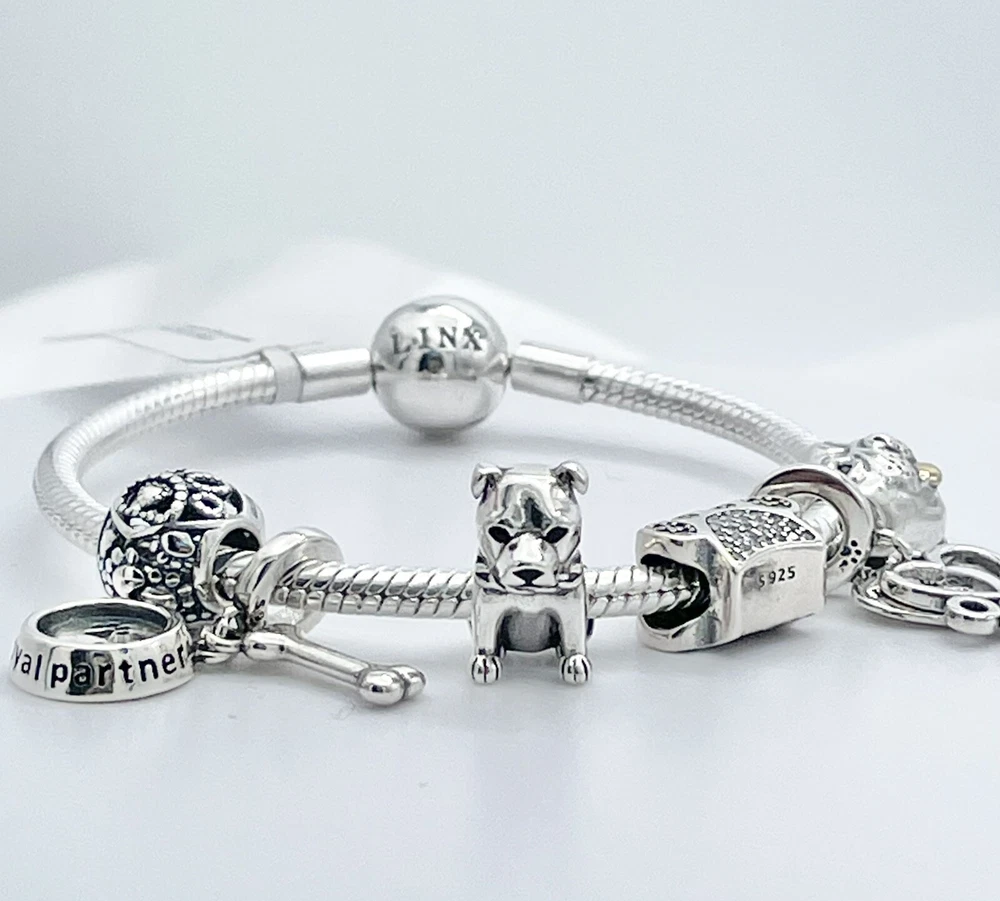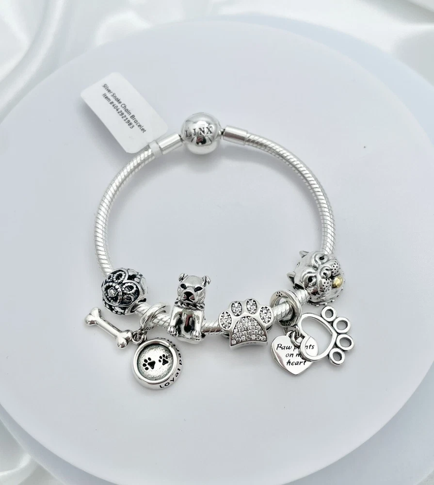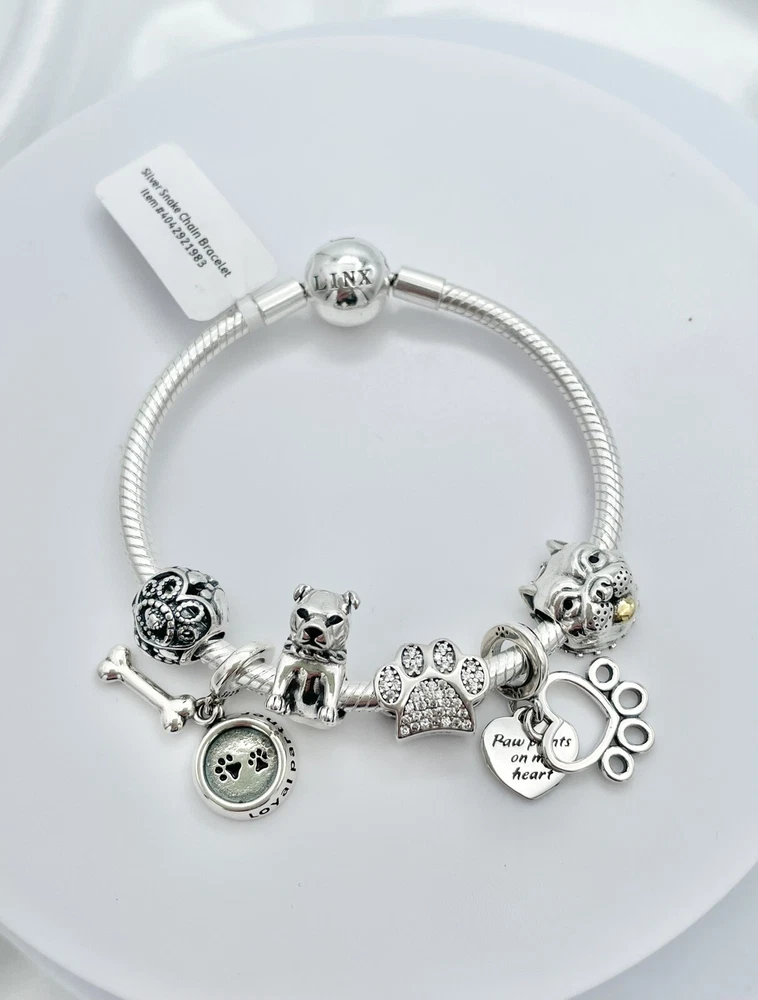 Linx snake chain style charm bracelet in 925 sterling silver, with a ball clasp, featuring the signature Linx logo. This beautiful bracelet features 7 Linx charms also in 925 Sterling silver. Size 7.5 Bracelet is also available in sizes 6.3 (toddler size), 6.7, 7.1, 7.9, and 8.3. Should you require one of these sizes, please message us prior to purchasing and we will create a listing for you in your requested size. Please remember to add an additional inch to the measurement of your wrist in order to allow room for your charms, as the charms will cause the bracelet to fit a bit tighter. Bracelet is new with tags and will also come with the original Linx velvet jewelry pouch, and Linx sterling silver polishing cloth.