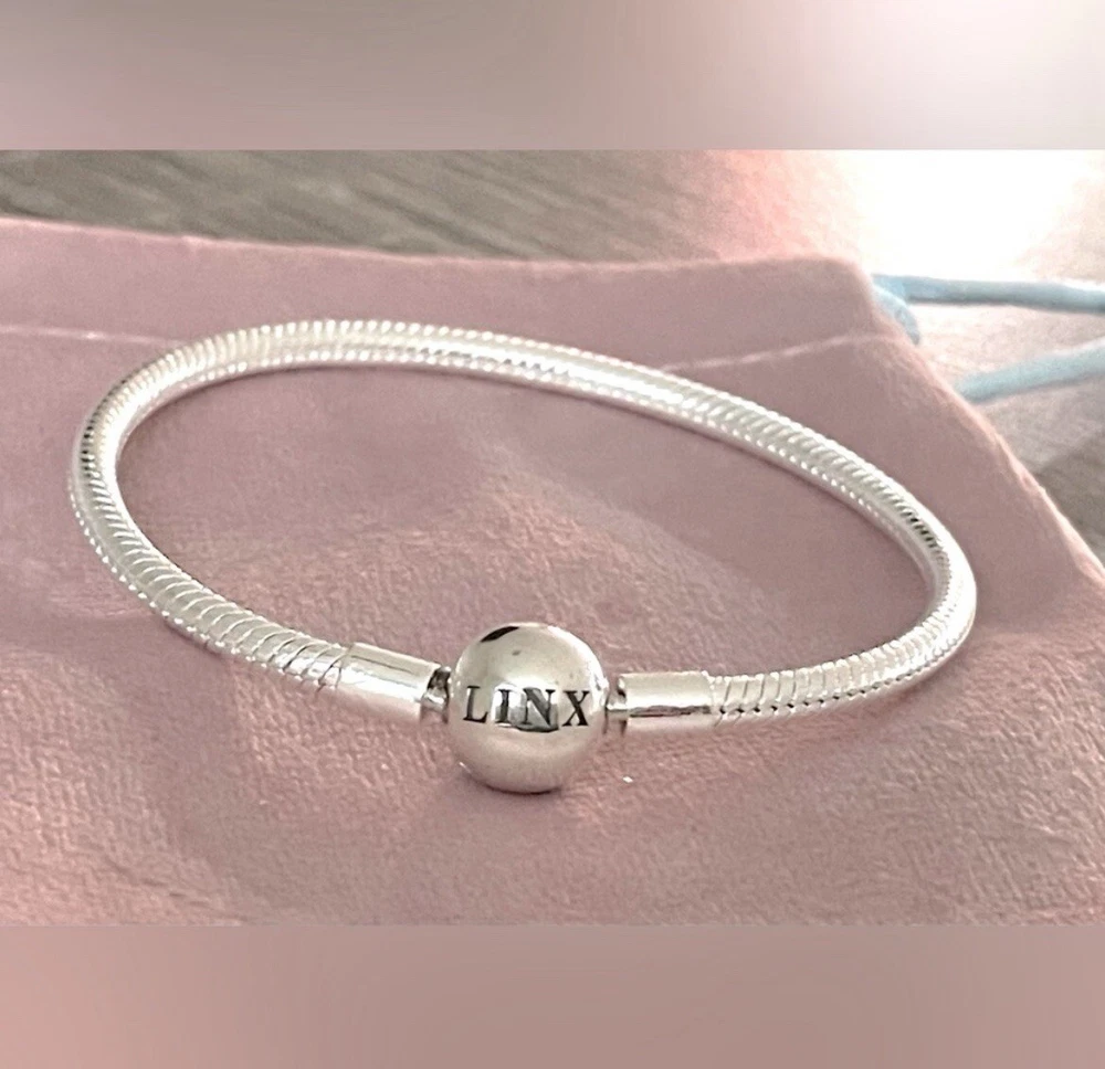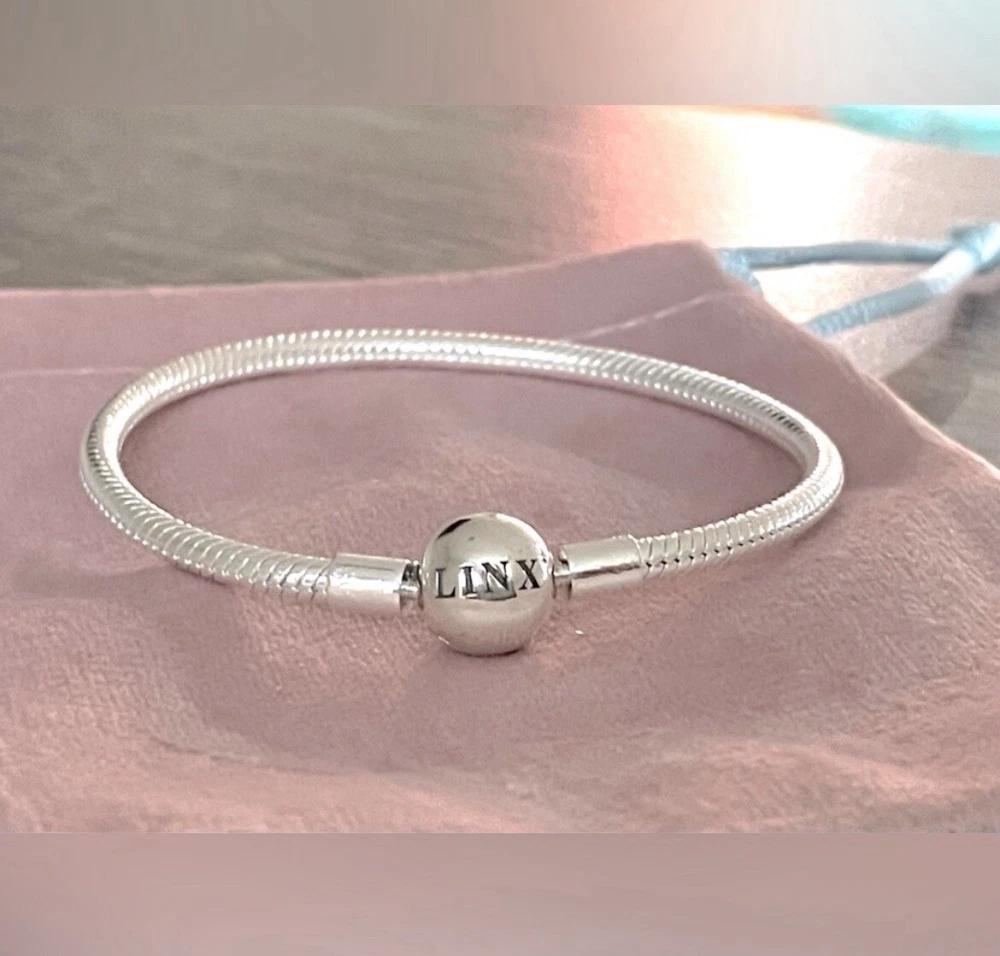Linx snake chain style charm bracelet in 925 sterling silver, with a ball clasp featuring the signature Linx logo. Linx charm bracelets are compatible with not only Linx brand charms, but most standard size charms of other brands as well. This bracelet will new with tags, in the original Linx velvet jewelry pouch and will include a sterling silver polishing cloth. This bracelet is size 6.3 (toddler size), but is also available in sizes 6.7, 7.1, 7.5, 7.9, and 8.3 on other listings. *** PLEASE ADD 1 INCH TO THE MEASUREMENT OF YOUR WRIST AND ORDER TO ALLOW ROOM FOR THE CHARMS, AS THE CHARMS WILL CAUSE THE BRACELET TO FIT A BIT TIGHTER. Please message us with any questions about sizing prior to purchasing, we are happy to help. Selecting the appropriate sizes extremely important, as we are unable to offer sizing exchanges.