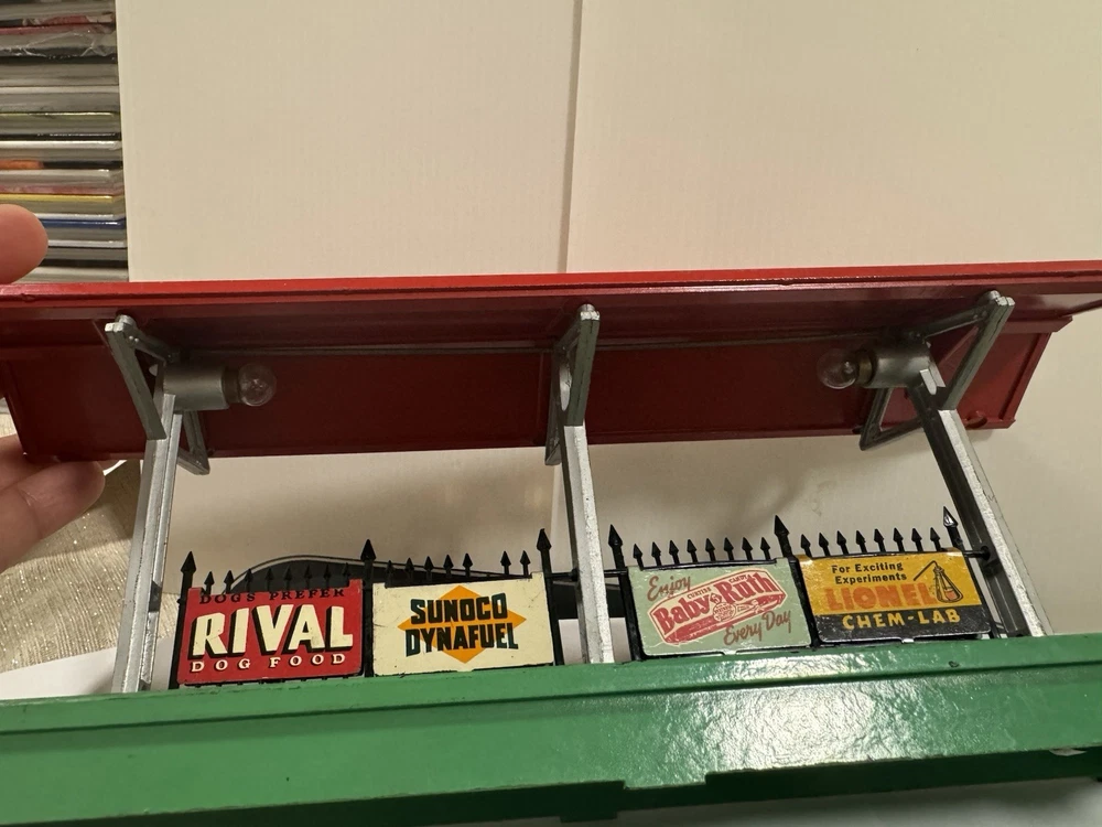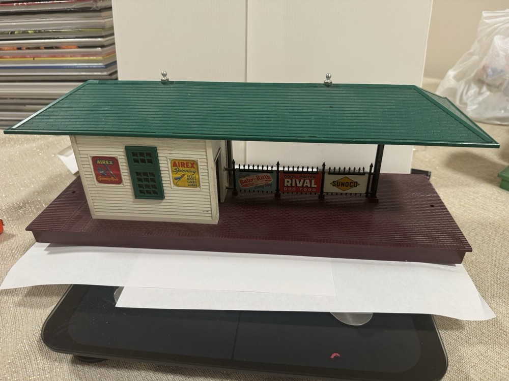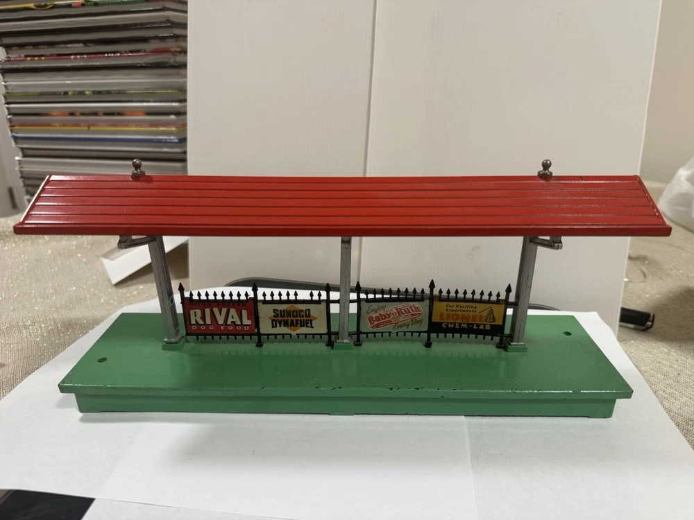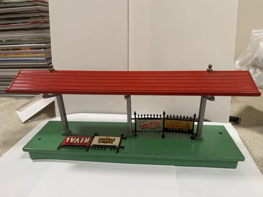 Add a touch of vintage charm to your model railroad setup with the Lionel 156 Illuminated Station Platform. Designed to bring your train layouts to life, this O gauge station platform is a quintessential piece for enthusiasts who value detail and authenticity. The platform's illumination feature adds a realistic touch to your miniature world, enhancing the overall visual experience of your model trains. Crafted by Lionel, a trusted name in model railroads, this station platform is a testament to the brand's commitment to quality and design. It's an excellent addition to any collection or layout, promising to elevate your model train environment with its classic elegance and durable construction. Whether for display or interactive play, the Lionel 156 platform is sure to impress. One of the sign is loose!