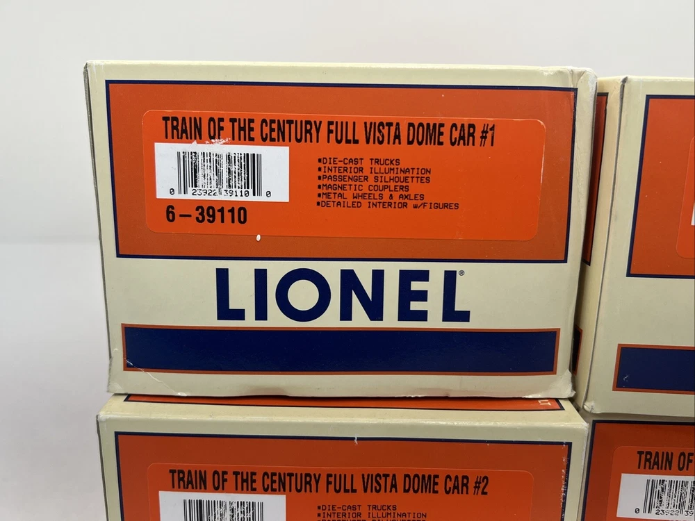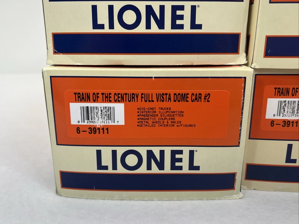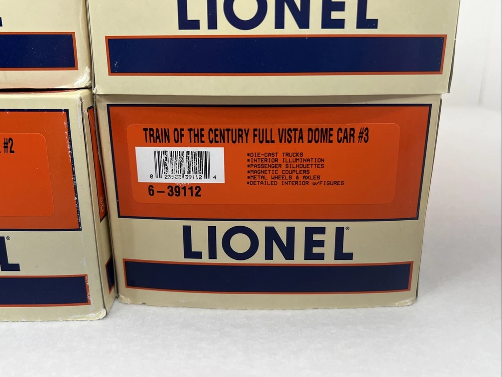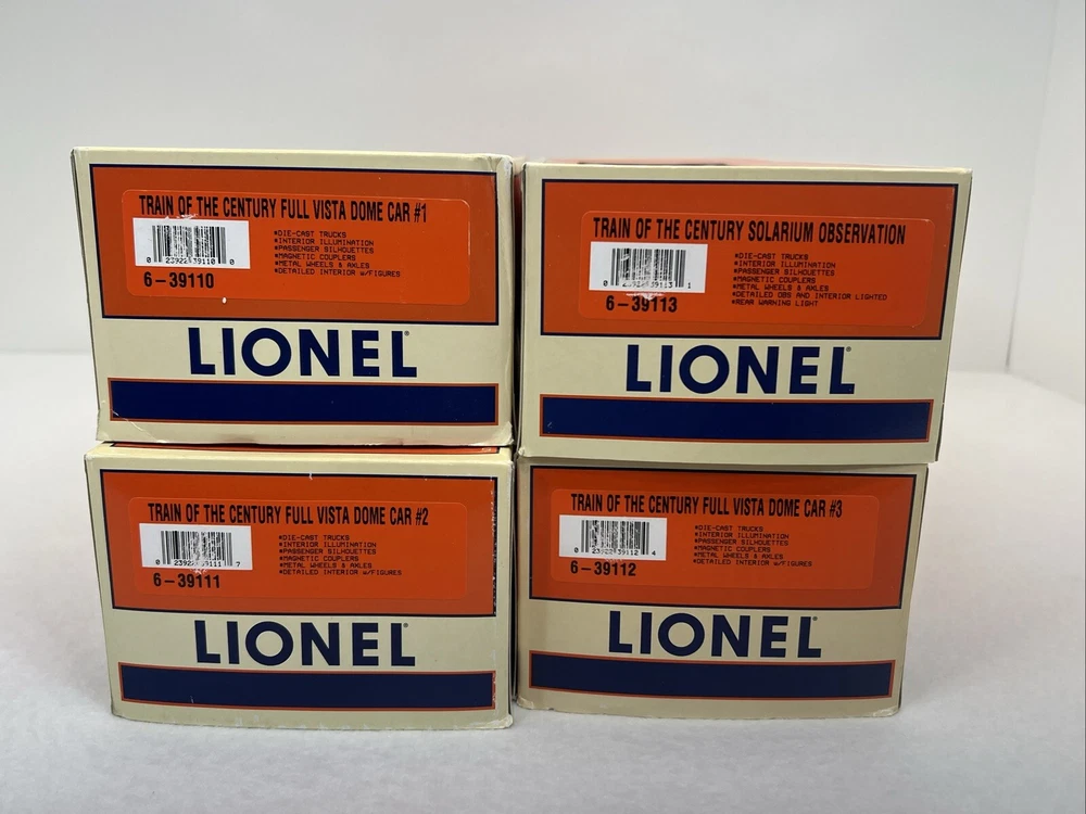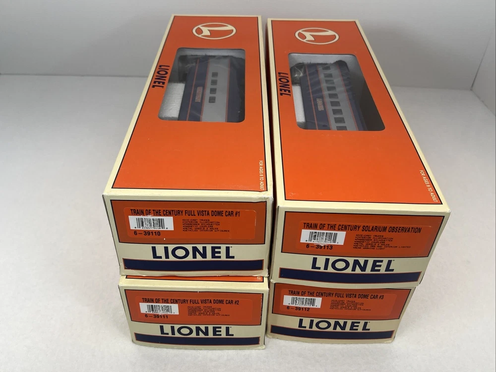 LIONEL TRAIN SPIRIT OF THE CENTURY 15" ALUMINUM 4 CAR PASSENGER SET O GAUGE THREE RAIL 6-39109 INCLUDES 6-39110 "SPIRIT" VISTA DOME CAR 6-39111 "OF THE" VISTA DOME CAR 6-39112 "CENTURY" VISTA DOME CAR 6-39113 "LIONEL" SOLARIUM OBSERVATION CAR NEW!!. ORIGINAL BOXES. BEAUTIFUL ALUMINUM. UNTESTED. STILL FACTORY WRAPPED. Passenger Car Features: O-Gauge, O-Scale Extruded aluminum bodies Die-cast trucks Stamped metal frame Interior illumination Exterior blinking end of train light on observation car Die-cast operating knuckle couplers Detailed interiors including molded figures Metal wheels & axles Each car length: 15" Minimum curve: O-31 WILL BE PACKED TO ENSURE SAFE DELIVERY ! Winning US bidder receives FREE SHIPPING USPS Priority UPS !! Canada Priority shipping is available . All other countries please email for a mailing quote. Thanks for looking! I ship everyday!!!!