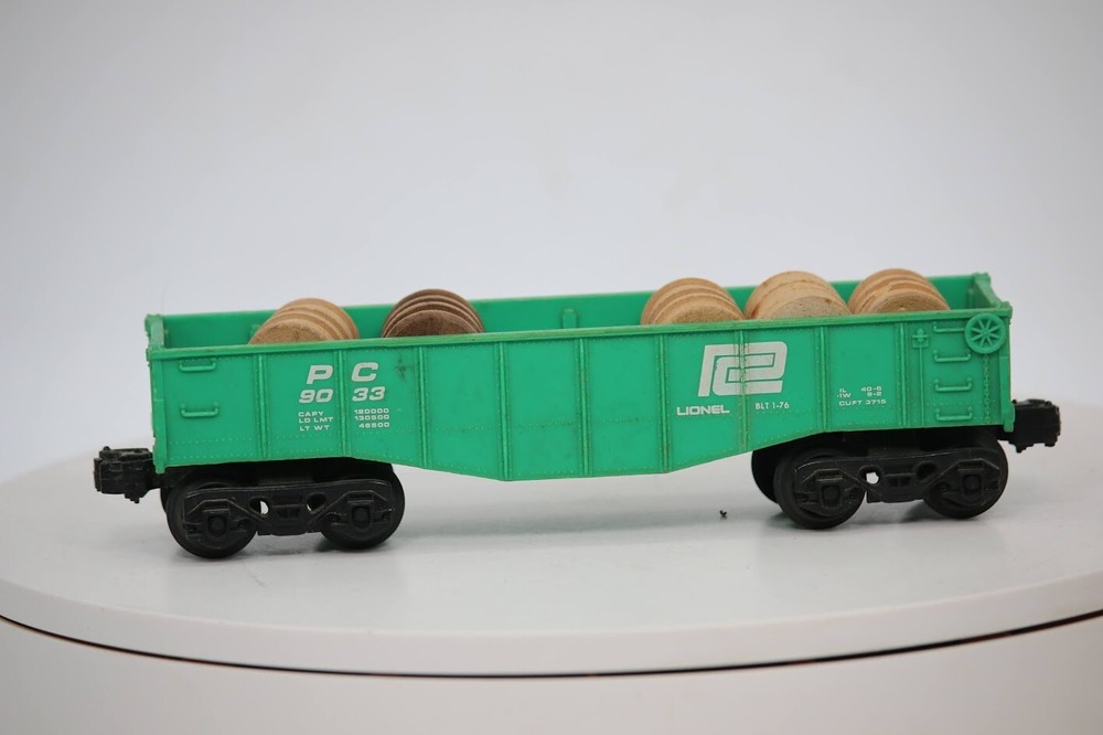 Lionel 9033 Underbelly Penn Central Green Gondola Freight Car Train w/(5) Barrel SKU#009204 We ships USPS. Like what you see make an offer. We will entertain any offers or opinions you would like to share with us. We now have over 200 trains up for sale and are testing more and posting more everyday!! PLEASE see photos for detailed condition!! There may be pieces that are missing or broken including, but not limited to, couplers, brake wheels, steps, ladders, railings, etc. May need detailed cleaning. PLEASE LOOK AT THE PHOTOS CAREFULLY BEFORE PURCHASING!! If you are purchasing more than one item from us and would like combined shipping, PLEASE request an adjusted invoice from us while still in the cart and BEFORE paying. Ebay does not usually calculate combined shipping accurately and you might get overcharged. Please be aware that when we photograph items, we use lighting that will show the details well. Although we try to present the product as accurately as possible, the lighting may affect the overall look of the item by appearing lighter/darker or possibly a different hue than the actual item. Depending on the type of lighting you have in your home, there may be some differences between the photos and the actual item. If this is a concern of yours, please feel free to request additional photos made in natural lighting or ask for a more detailed description of the item PRIOR TO PURCHASE! PLEASE NOTE: We greatly appreciate your interest in our item for sale. We look forward to a pleasant, quick and satisfying transaction for everybody, so please note the following information before bidding. Thank you! ITEM DESCRIPTIONS: * We will try to describe items well and provide plenty of photos. Please review these carefully before bidding or purchasing. * Only the items pictured and described are what you will receive when purchased. * We will occasionally offer an item clearly marked "AS-IS". This means that we are not sure if it works because we are unable to test it for whatever reason. We will offer these at a discounted price than a similar "working" item. It is possible that these items will work fine, but it also is possible that these items are more useful for their parts. Please only bid on or purchase these items if you are well aware of this, as we will only provide refunds of actual item price (no shipping cost refunds) for these items. * If you have any questions that aren't addressed by the descriptions or photos, please feel free to ask before you bid. SHIPPING: * We usually do not offer shipping to international addresses, but ARE WILLING TO TAKE SPEICAL CONSIDERATIONS. * We try to pack items as carefully as possible, but damage may occur during shipping. If you receive an item that was damaged in shipping, please contact us and we will work with you to resolve the problem. * We will combine shipping costs for all items the same buyer purchases from us within 2 days. Please wait to pay for items until you're done shopping with us. Please contact us if you're expecting to buy more items from us, or to have us adjust the shipping costs. * We will usually ship items out within 24 hours of payment being received Sunday through Friday at noon. We will notify the buyer if there will be a delay in shipping for some reason. Please allow additional time for holidays and weekends when the post office is closed. If payment is received after noon (EST) on Friday, the item might not be shipped until the following Monday. * We do try to recycle shipping materials as much as possible. RETURNS: We abide by eBay's Money Back Guarantee. We definitely want our customers to be happy with their purchase! You may return an item within 30 days of receiving it with the following guidelines: * If the item is defective or damaged (unless we clearly marked the listing "AS-IS"), the buyer will receive a full refund after the buyer returns it and it is received by us. Customers who falsely claim their item is defective, damaged, or not as described in order to receive a full refund and free return shipping will be permanently blocked from making future purchases from us. * If the item is as described (including "AS-IS" items) and the buyer decides for any other reason than defective/damaged to return it, only the actual price of the item will be refunded once it has been returned and it is received by us. The buyer will be asked to pay all original and return shipping charges. This includes all reasons other than defective/damaged, including wrong size, wrong type, changed mind, etc. All "AS-IS" items will fall into this category of return. Please make sure the item is what you want before purchasing it. * Please contact us before initiating a refund request. FEEDBACK: We always leave feedback at the end of transaction. We consider the transaction to be over when we receive feedback from the buyer confirming the item arrived satisfactorily. If you are unsatisfied with your purchase please contact us before leaving neutral or negative feedback. WE APPRECIATE POSITIVE FEEDBACK IF YOU ARE SATISFIED WITH YOUR PURCHASE! THANK YOU FOR YOUR INTEREST IN THIS ITEM!