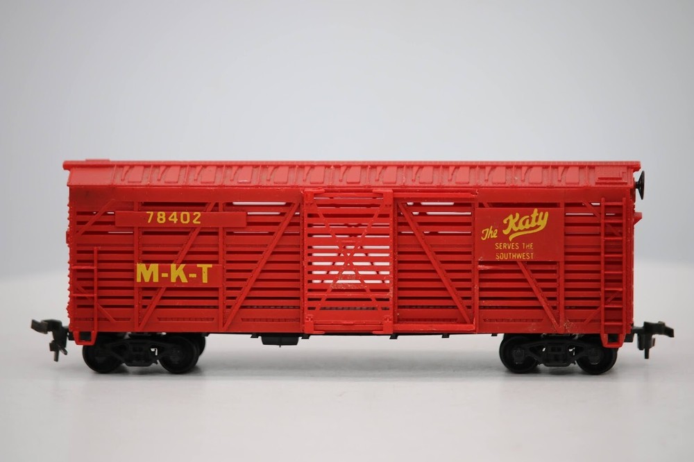 Lionel HO Scale "MKT - The Katy" 78402 40' Livestock Cattle Freight Train Car SKU#004598 Look closely at the pictures to see further details. We ships USPS PLEASE see photos for detailed condition!! PLEASE LOOK AT THE PHOTOS CAREFULLY BEFORE PURCHASING!! If you are purchasing more than one item from us and would like combined shipping, PLEASE request an adjusted invoice from us while still in the cart and BEFORE paying. eBay does not usually calculate combined shipping accurately and you might get overcharged. Please be aware that when we photograph items, we use lighting that will show the details well. Although we try to present the product as accurately as possible, the lighting may affect the overall look of the item by appearing lighter/darker or possibly a different hue than the actual item. Depending on the type of lighting you have in your home, there may be some differences between the photos and the actual item. If this is a concern of yours, please feel free to request additional photos made in natural lighting or ask for a more detailed description of the item PRIOR TO PURCHASE! PLEASE NOTE: We greatly appreciate your interest in our item for sale. We look forward to a pleasant, quick and satisfying transaction for everybody, so please note the following information before bidding. Thank you! ITEM DESCRIPTIONS: * We will try to describe items well and provide plenty of photos. Please review these carefully before bidding or purchasing. * Only the items pictured and described are what you will receive when purchased. * We will occasionally offer an item clearly marked "AS-IS". This means that we are not sure if it works because we are unable to test it for whatever reason. We will offer these at a discounted price then a similar "working" item. It is possible that these items will work fine, but it also is possible that these items are more useful for their parts. Please only bid on or purchase these items if you are well aware of this, as we will only provide refunds of actual item price (no shipping cost refunds) for these items. * If you have any questions that aren't addressed by the descriptions or photos, please feel free to ask before you bid. * There may be pieces that are missing or broken including, but not limited to, couplers, brake wheels, steps, ladders, railings, minor rust spots or cracks, etc. May need detailed cleaning SHIPPING: * We usually do not offer shipping to international addresses, but ARE WILLING TO TAKE CONSIDERATIONS. * We try to pack items as carefully as possible, but damage may occur during shipping. If you receive an item that was damaged in shipping, please contact us and we will work with you to resolve the problem. * We will combine shipping costs for all items the same buyer purchases from us within 2 days. Please wait to pay for items until you're done shopping with us. Please contact us if you're expecting to buy more items from us, or to have us adjust the shipping costs. * We will usually ship items out within 24 hours of payment being received Sunday through Friday at noon. We will notify the buyer if there will be a delay in shipping for some reason. Please allow additional time for holidays and weekends when the post office is closed. If payment is received after noon (EST) on Friday, the item might not be shipped until the following Monday. * We do try to recycle shipping materials as much as possible. RETURNS: We abide by eBay's Money Back Guarantee. We definitely want our customers to be happy with their purchase! You may return an item within 30 days of receiving it with the following guidelines: * If the item is defective or damaged (unless we clearly marked the listing "AS-IS"), the buyer will receive a full refund after the buyer returns it and it is received by us. Customers who falsely claim their item is defective, damaged, or not as described in order to receive a full refund and free return shipping will be permanently blocked from making future purchases from us. * If the item is as described (including "AS-IS" items) and the buyer decides for any other reason than defective/damaged to return it, only the actual price of the item will be refunded once it has been returned and it is received by us. The buyer will be asked to pay all original and return shipping charges. This includes all reasons other than defective/damaged, including wrong size, wrong type, changed mind, etc. All "AS-IS" items will fall into this category of return. Please make sure the item is what you want before purchasing it. * Please contact us before initiating a refund request. FEEDBACK: We always leave feedback at the end of transaction. We consider the transaction to be over when we receive feedback from the buyer confirming the item arrived satisfactorily. If you are unsatisfied with your purchase please contact us before leaving neutral or negative feedback. WE APPRECIATE POSITIVE FEEDBACK IF YOU ARE SATISFIED WITH YOUR PURCHASE! THANK YOU FOR YOUR INTEREST IN THIS ITEM!