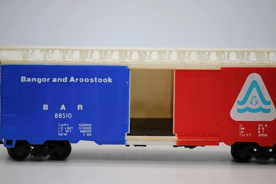 LIONEL HO SCALE: BANGOR & AROOSTOOK BAR #88510 STEEL BOXCAR. VINTAGE, RED WHITE SKU#006526 Look closely at the pictures to see further details. We ships USPS PLEASE see photos for detailed condition!! PLEASE LOOK AT THE PHOTOS CAREFULLY BEFORE PURCHASING!! If you are purchasing more than one item from us and would like combined shipping, PLEASE request an adjusted invoice from us while still in the cart and BEFORE paying. eBay does not usually calculate combined shipping accurately and you might get overcharged. Please be aware that when we photograph items, we use lighting that will show the details well. Although we try to present the product as accurately as possible, the lighting may affect the overall look of the item by appearing lighter/darker or possibly a different hue than the actual item. Depending on the type of lighting you have in your home, there may be some differences between the photos and the actual item. If this is a concern of yours, please feel free to request additional photos made in natural lighting or ask for a more detailed description of the item PRIOR TO PURCHASE! PLEASE NOTE: We greatly appreciate your interest in our item for sale. We look forward to a pleasant, quick and satisfying transaction for everybody, so please note the following information before bidding. Thank you! ITEM DESCRIPTIONS: * We will try to describe items well and provide plenty of photos. Please review these carefully before bidding or purchasing. * Only the items pictured and described are what you will receive when purchased. * We will occasionally offer an item clearly marked "AS-IS". This means that we are not sure if it works because we are unable to test it for whatever reason. We will offer these at a discounted price then a similar "working" item. It is possible that these items will work fine, but it also is possible that these items are more useful for their parts. Please only bid on or purchase these items if you are well aware of this, as we will only provide refunds of actual item price (no shipping cost refunds) for these items. * If you have any questions that aren't addressed by the descriptions or photos, please feel free to ask before you bid. * There may be pieces that are missing or broken including, but not limited to, couplers, brake wheels, steps, ladders, railings, minor rust spots or cracks, etc. May need detailed cleaning SHIPPING: * We usually do not offer shipping to international addresses, but ARE WILLING TO TAKE CONSIDERATIONS. * We try to pack items as carefully as possible, but damage may occur during shipping. If you receive an item that was damaged in shipping, please contact us and we will work with you to resolve the problem. * We will combine shipping costs for all items the same buyer purchases from us within 2 days. Please wait to pay for items until you're done shopping with us. Please contact us if you're expecting to buy more items from us, or to have us adjust the shipping costs. * We will usually ship items out within 24 hours of payment being received Sunday through Friday at noon. We will notify the buyer if there will be a delay in shipping for some reason. Please allow additional time for holidays and weekends when the post office is closed. If payment is received after noon (EST) on Friday, the item might not be shipped until the following Monday. * We do try to recycle shipping materials as much as possible. RETURNS: We abide by eBay's Money Back Guarantee. We definitely want our customers to be happy with their purchase! You may return an item within 30 days of receiving it with the following guidelines: * If the item is defective or damaged (unless we clearly marked the listing "AS-IS"), the buyer will receive a full refund after the buyer returns it and it is received by us. Customers who falsely claim their item is defective, damaged, or not as described in order to receive a full refund and free return shipping will be permanently blocked from making future purchases from us. * If the item is as described (including "AS-IS" items) and the buyer decides for any other reason than defective/damaged to return it, only the actual price of the item will be refunded once it has been returned and it is received by us. The buyer will be asked to pay all original and return shipping charges. This includes all reasons other than defective/damaged, including wrong size, wrong type, changed mind, etc. All "AS-IS" items will fall into this category of return. Please make sure the item is what you want before purchasing it. * Please contact us before initiating a refund request. FEEDBACK: We always leave feedback at the end of transaction. We consider the transaction to be over when we receive feedback from the buyer confirming the item arrived satisfactorily. If you are unsatisfied with your purchase please contact us before leaving neutral or negative feedback. WE APPRECIATE POSITIVE FEEDBACK IF YOU ARE SATISFIED WITH YOUR PURCHASE! THANK YOU FOR YOUR INTEREST IN THIS ITEM!