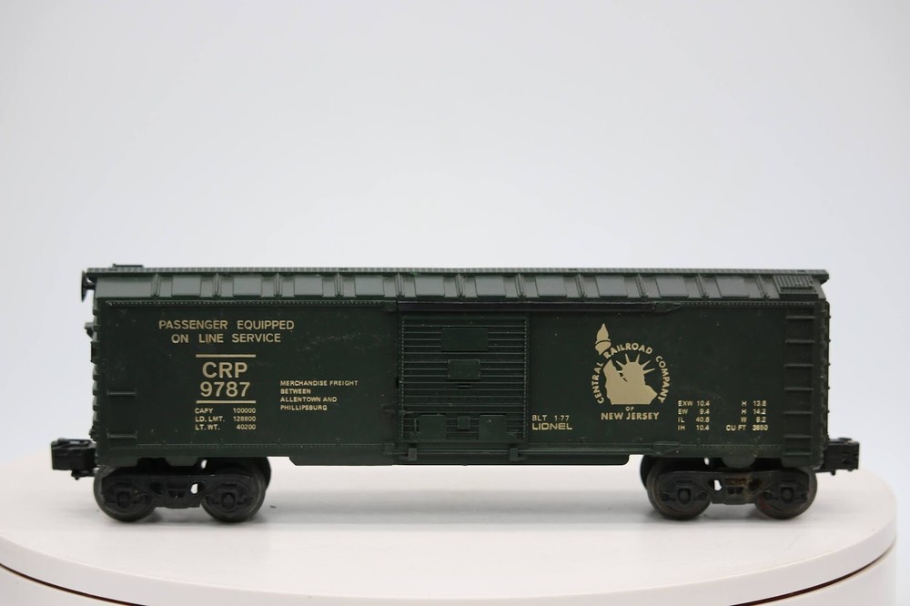 Lionel Jersey Central Box Car 6-9787 SKU#006844 Look closely at the pictures to see further details. We ships USPS PLEASE see photos for detailed condition!! PLEASE LOOK AT THE PHOTOS CAREFULLY BEFORE PURCHASING!! If you are purchasing more than one item from us and would like combined shipping, PLEASE request an adjusted invoice from us while still in the cart and BEFORE paying. eBay does not usually calculate combined shipping accurately and you might get overcharged. Please be aware that when we photograph items, we use lighting that will show the details well. Although we try to present the product as accurately as possible, the lighting may affect the overall look of the item by appearing lighter/darker or possibly a different hue than the actual item. Depending on the type of lighting you have in your home, there may be some differences between the photos and the actual item. If this is a concern of yours, please feel free to request additional photos made in natural lighting or ask for a more detailed description of the item PRIOR TO PURCHASE! PLEASE NOTE: We greatly appreciate your interest in our item for sale. We look forward to a pleasant, quick and satisfying transaction for everybody, so please note the following information before bidding. Thank you! ITEM DESCRIPTIONS: * We will try to describe items well and provide plenty of photos. Please review these carefully before bidding or purchasing. * Only the items pictured and described are what you will receive when purchased. * We will occasionally offer an item clearly marked "AS-IS". This means that we are not sure if it works because we are unable to test it for whatever reason. We will offer these at a discounted price then a similar "working" item. It is possible that these items will work fine, but it also is possible that these items are more useful for their parts. Please only bid on or purchase these items if you are well aware of this, as we will only provide refunds of actual item price (no shipping cost refunds) for these items. * If you have any questions that aren't addressed by the descriptions or photos, please feel free to ask before you bid. * There may be pieces that are missing or broken including, but not limited to, couplers, brake wheels, steps, ladders, railings, minor rust spots or cracks, etc. May need detailed cleaning SHIPPING: * We usually do not offer shipping to international addresses, but ARE WILLING TO TAKE CONSIDERATIONS. * We try to pack items as carefully as possible, but damage may occur during shipping. If you receive an item that was damaged in shipping, please contact us and we will work with you to resolve the problem. * We will combine shipping costs for all items the same buyer purchases from us within 2 days. Please wait to pay for items until you're done shopping with us. Please contact us if you're expecting to buy more items from us, or to have us adjust the shipping costs. * We will usually ship items out within 24 hours of payment being received Sunday through Friday at noon. We will notify the buyer if there will be a delay in shipping for some reason. Please allow additional time for holidays and weekends when the post office is closed. If payment is received after noon (EST) on Friday, the item might not be shipped until the following Monday. * We do try to recycle shipping materials as much as possible. RETURNS: We abide by eBay's Money Back Guarantee. We definitely want our customers to be happy with their purchase! You may return an item within 30 days of receiving it with the following guidelines: * If the item is defective or damaged (unless we clearly marked the listing "AS-IS"), the buyer will receive a full refund after the buyer returns it and it is received by us. Customers who falsely claim their item is defective, damaged, or not as described in order to receive a full refund and free return shipping will be permanently blocked from making future purchases from us. * If the item is as described (including "AS-IS" items) and the buyer decides for any other reason than defective/damaged to return it, only the actual price of the item will be refunded once it has been returned and it is received by us. The buyer will be asked to pay all original and return shipping charges. This includes all reasons other than defective/damaged, including wrong size, wrong type, changed mind, etc. All "AS-IS" items will fall into this category of return. Please make sure the item is what you want before purchasing it. * Please contact us before initiating a refund request. FEEDBACK: We always leave feedback at the end of transaction. We consider the transaction to be over when we receive feedback from the buyer confirming the item arrived satisfactorily. If you are unsatisfied with your purchase please contact us before leaving neutral or negative feedback. WE APPRECIATE POSITIVE FEEDBACK IF YOU ARE SATISFIED WITH YOUR PURCHASE! THANK YOU FOR YOUR INTEREST IN THIS ITEM!