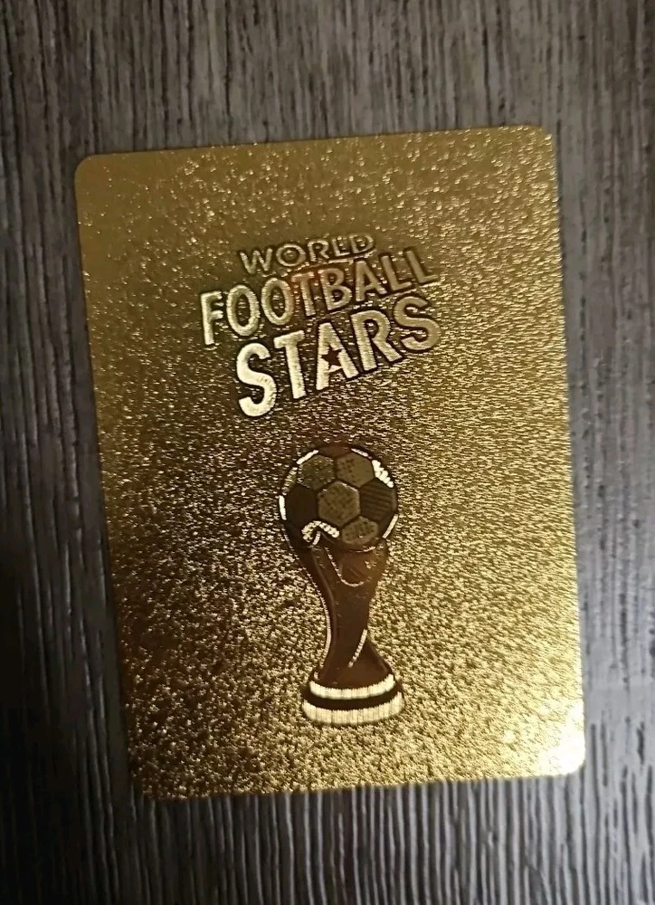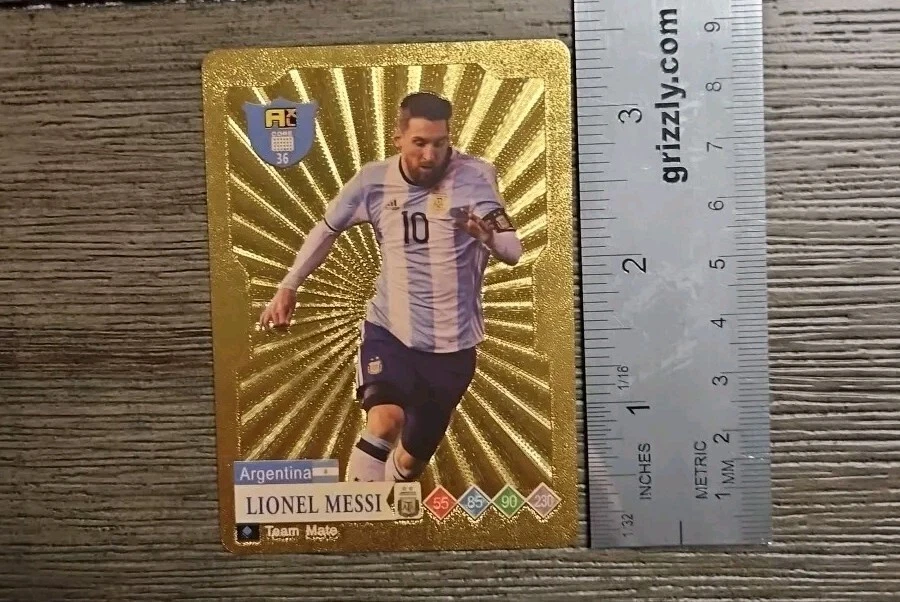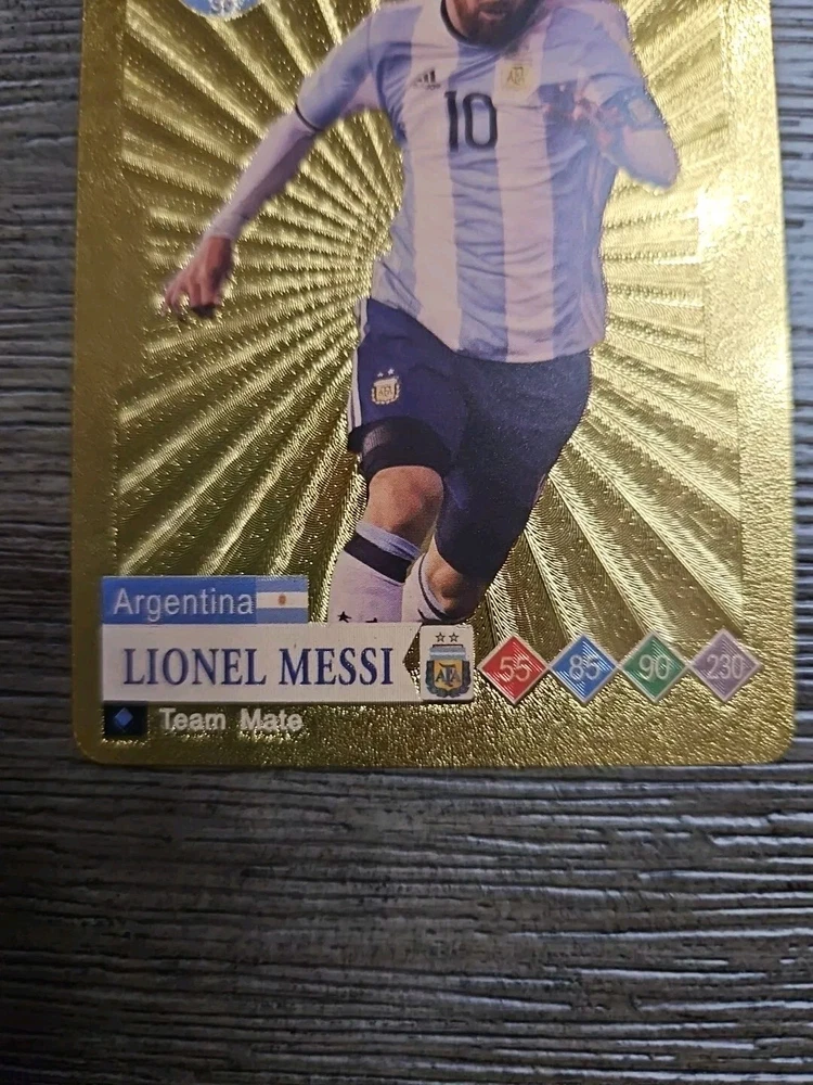 This is a Lionel Messi Soccer Card from the Gold Series of World Football Stars. It features Messi as a player for the Argentina National Team during the 2022-23 season. The card is a gold parallel variety, manufactured in 2023 by World Football Stars Gold Cards. It is an original trading card printed on plastic, showcasing Messi in his Argentina and Inter Miami kits, with a focus on his performances in the FIFA World Cup.