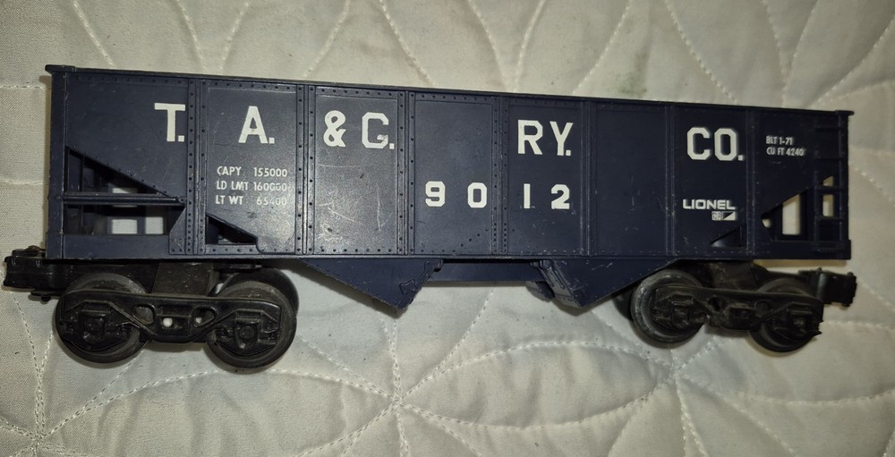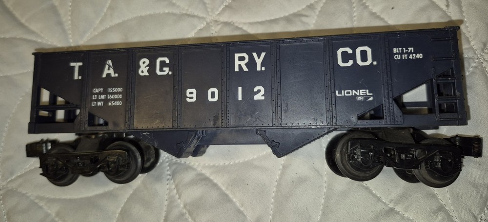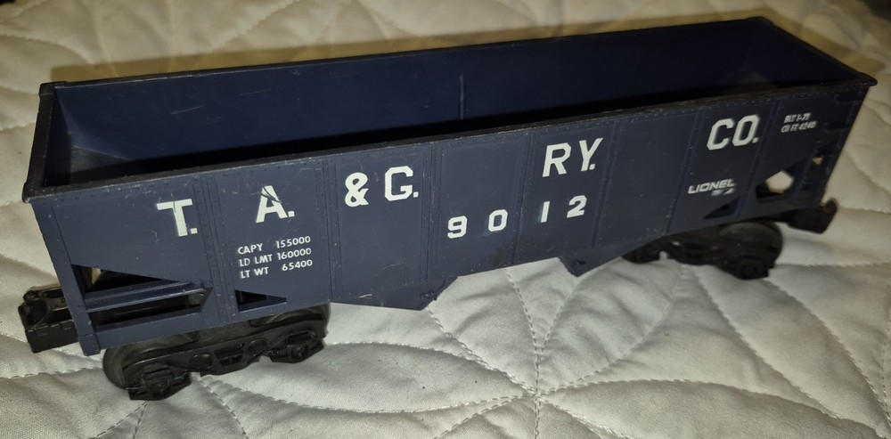 The CB6 Lionel No. 9012 TA & G Hopper in Dark Blue is a rare and collectible O gauge model train car that is ready to go out of the box. This vintage replica of a 2 bay hopper features a dark blue color and is made of plastic with a scale of 1:43. It is part of the Lionel brand's Transportation theme and is suitable for collectors aged 17 years and up. The analog control system and 3-rail-2-conductor rail system make it a unique addition to any model railroad setup.