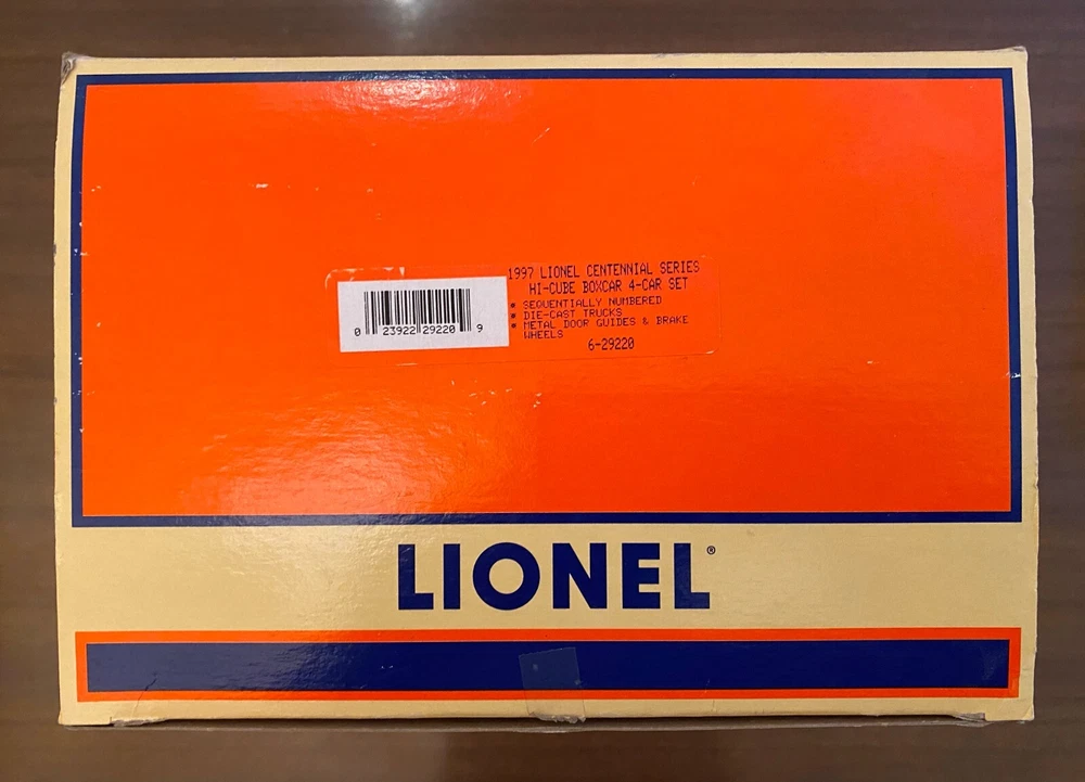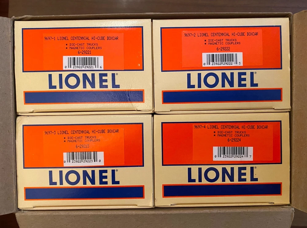 Lionel 6-29220 O Gauge 1997 Centennial Series Hi-Cube Boxcars (Set of 4) NEW in original packaging. These cars have not been run. I am the original owner, and the set has been stored in a non-smoking home. Offers accepted. I can combine shipping for multiple items - please check out my other Lionel auctions!