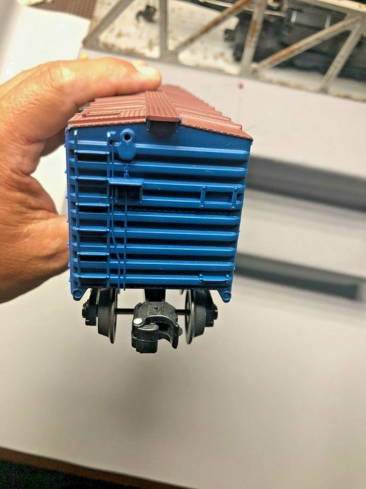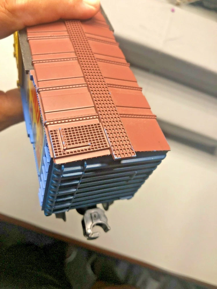 there is no box this was in a set it is in like new condition it has 2 operating magnetic couplers metal wheels & axles i do combine shipping & tracking # is included