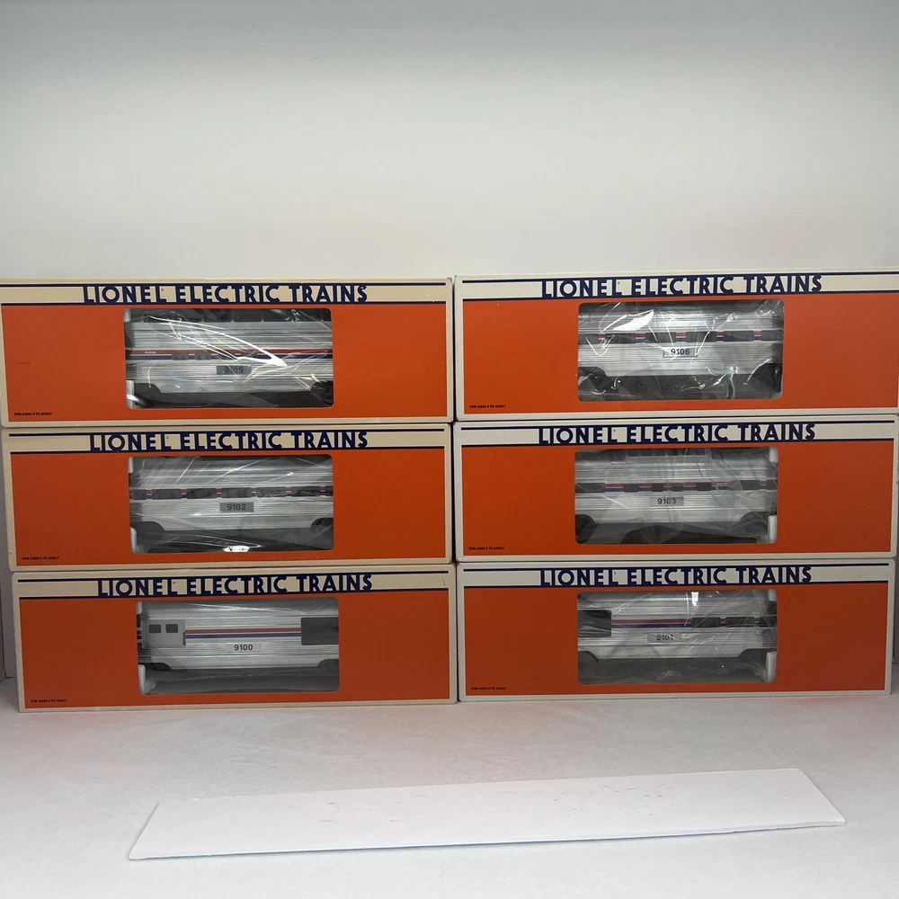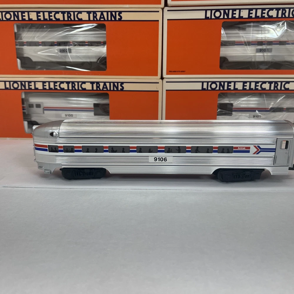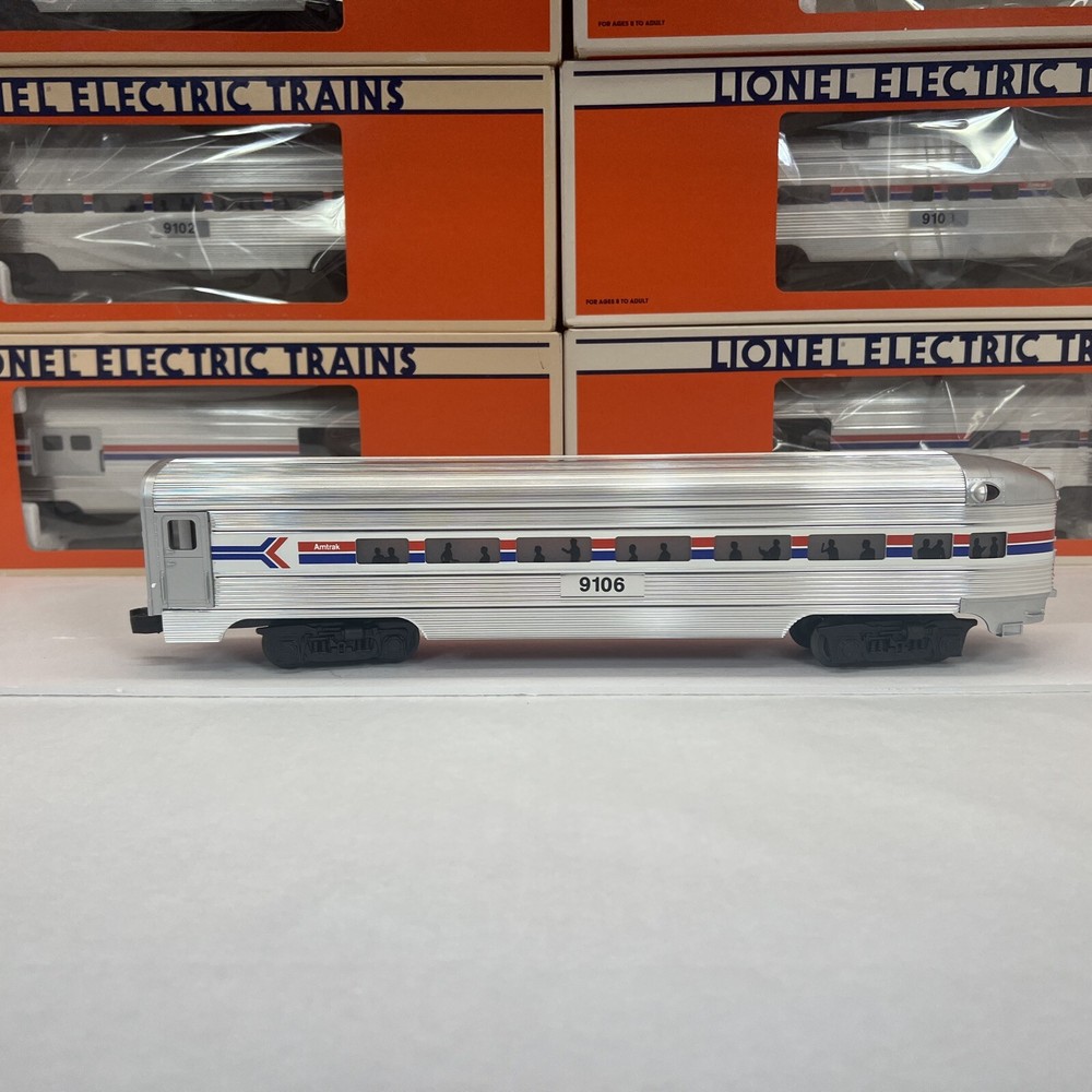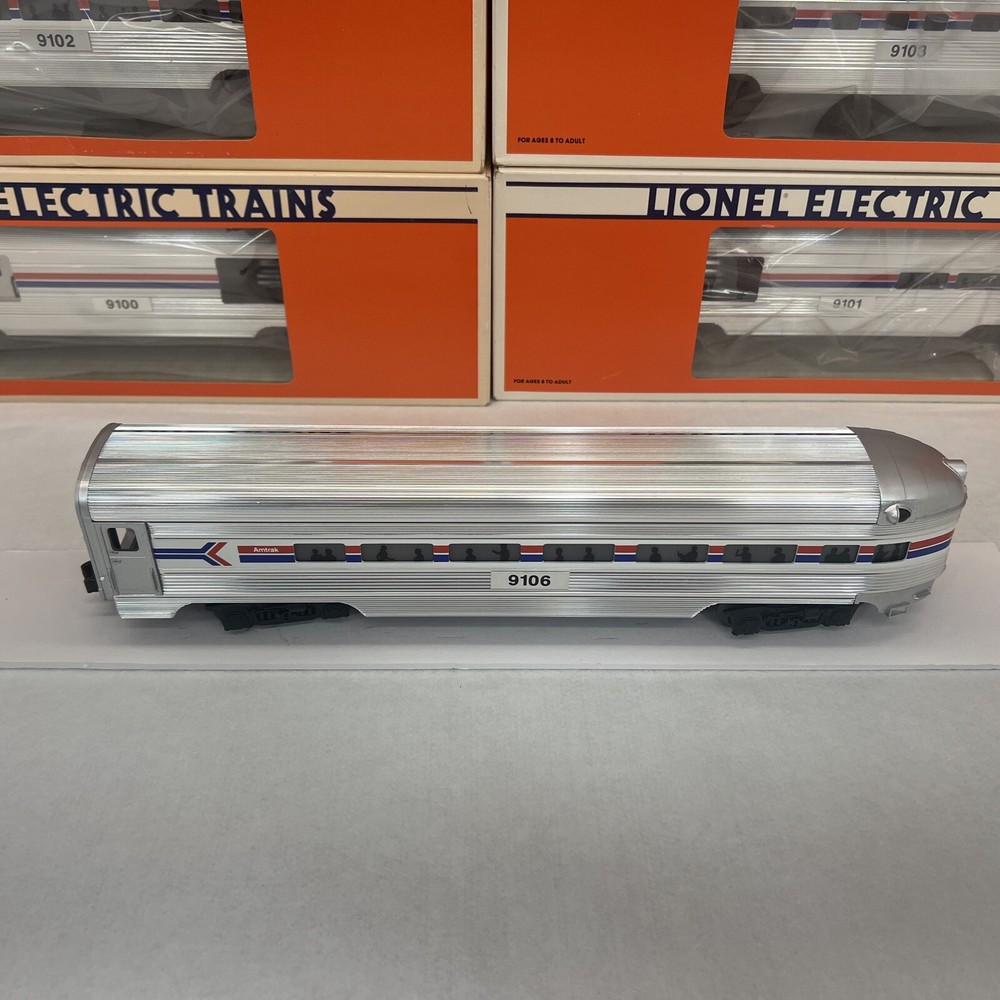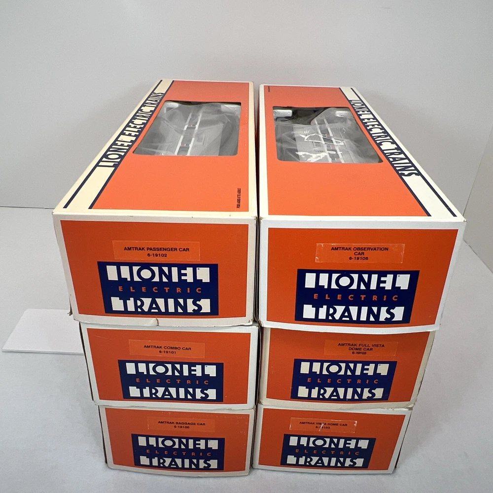 LIONEL AMTRAK ALUMINUM 15" 6 CAR PASSENGER SET O GAUGE THREE RAIL INCLUDES 6-19100 BAGGAGE CAR 6-19101 COMBO CAR 6-19102 PASSENGER CAR 6-19103 VISTA DOME CAR 6-19105 FULL VISTA DOME CAR 6-19106 OBSERVATION CAR NEW!!. ORIGINAL BOXES. BEAUTIFUL 15" ALUMINUM SET.. NO TRACK TIME. CARS WERE DISPLAYED. FEATURES Aluminum bodies Die-cast trucks with magnetic couplers. Passenger Silhouettes Length: 15" each WILL BE PACKED TO ENSURE SAFE DELIVERY! Winning US bidder receives FREE SHIPPING USPS Priority UPS!! Canada Priority shipping is available . All other countries please email for a mailing quote. Thanks for looking! I ship everyday!!!!