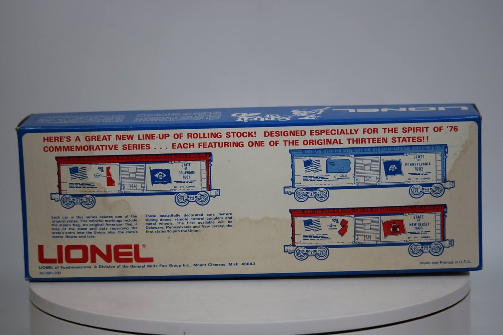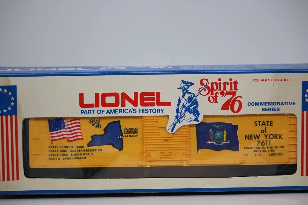 Here we have a Lionel 6-7611 O Gauge State of New York Boxcar #7611. This car is the from the famous Lionel Bicentennial Set from 1974-76. The complete set includes the 1776 U36B Diesel, 13 boxcars numbered 7601 through 7613, each one commemorating one of the original 13 states in order of their admission to the Union, and the 7600 Caboose. This is a very sharp set and the decorations are attractive and well done. This car features a very durable plastic construction with sliding doors, molded details, plastic trucks, metal wheels and axles, operating knuckle couplers, and attractive decoration. This item has been graded per TCA standards C-7: Excellent based on visual appearance. There are light nicks and scratches on the surface of this item. The instruction manual is not included. The original box is included. Overall condition is Excellent. Condition: Excellent ( C-7 ) Operational Status: Not Applicable Original Box: Yes ( P-6 ) Manufacturer: Lionel Model Number: 6-7611 Years Manufactured: 1975 - 1976 Road Name: Spirit of 76 Scale/Era: O MPC Model Type: Freight Cars We ships USPS PLEASE see photos for detailed condition!! PLEASE LOOK AT THE PHOTOS CAREFULLY BEFORE PURCHASING!! If you are purchasing more than one item from us and would like combined shipping, PLEASE request an adjusted invoice from us while still in the cart and BEFORE paying. Ebay does not usually calculate combined shipping accurately and you might get overcharged. Please be aware that when we photograph items, we use lighting that will show the details well. Although we try to present the product as accurately as possible, the lighting may affect the overall look of the item by appearing lighter/darker or possibly a different hue than the actual item. Depending on the type of lighting you have in your home, there may be some differences between the photos and the actual item. If this is a concern of yours, please feel free to request additional photos made in natural lighting or ask for a more detailed description of the item PRIOR TO PURCHASE! PLEASE NOTE: We greatly appreciate your interest in our item for sale. We look forward to a pleasant, quick and satisfying transaction for everybody, so please note the following information before bidding. Thank you! ITEM DESCRIPTIONS: * We will try to describe items well and provide plenty of photos. Please review these carefully before bidding or purchasing. * Only the items pictured and described are what you will receive when purchased. * We will occasionally offer an item clearly marked "AS-IS". This means that we are not sure if it works because we are unable to test it for whatever reason. We will offer these at a discounted price then a similar "working" item. It is possible that these items will work fine, but it also is possible that these items are more useful for their parts. Please only bid on or purchase these items if you are well aware of this, as we will only provide refunds of actual item price (no shipping cost refunds) for these items. * If you have any questions that aren't addressed by the descriptions or photos, please feel free to ask before you bid. SHIPPING: * We usually do not offer shipping to international addresses, but ARE WILLING TO TAKE CONSIDERATIONS. * We try to pack items as carefully as possible, but damage may occur during shipping. If you receive an item that was damaged in shipping, please contact us and we will work with you to resolve the problem. * We will combine shipping costs for all items the same buyer purchases from us within 2 days. Please wait to pay for items until you're done shopping with us. Please contact us if you're expecting to buy more items from us, or to have us adjust the shipping costs. * We will usually ship items out within 24 hours of payment being received Sunday through Friday at noon. We will notify the buyer if there will be a delay in shipping for some reason. Please allow additional time for holidays and weekends when the post office is closed. If payment is received after noon (EST) on Friday, the item might not be shipped until the following Monday. * We do try to recycle shipping materials as much as possible. RETURNS: We abide by eBay's Money Back Guarantee. We definitely want our customers to be happy with their purchase! You may return an item within 30 days of receiving it with the following guidelines: * If the item is defective or damaged (unless we clearly marked the listing "AS-IS"), the buyer will receive a full refund after the buyer returns it and it is received by us. Customers who falsely claim their item is defective, damaged, or not as described in order to receive a full refund and free return shipping will be permanently blocked from making future purchases from us. * If the item is as described (including "AS-IS" items) and the buyer decides for any other reason than defective/damaged to return it, only the actual price of the item will be refunded once it has been returned and it is received by us. The buyer will be asked to pay all original and return shipping charges. This includes all reasons other than defective/damaged, including wrong size, wrong type, changed mind, etc. All "AS-IS" items will fall into this category of return. Please make sure the item is what you want before purchasing it. * Please contact us before initiating a refund request. FEEDBACK: We always leave feedback at the end of transaction. We consider the transaction to be over when we receive feedback from the buyer confirming the item arrived satisfactorily. If you are unsatisfied with your purchase please contact us before leaving neutral or negative feedback. WE APPRECIATE POSITIVE FEEDBACK IF YOU ARE SATISFIED WITH YOUR PURCHASE! THANK YOU FOR YOUR INTEREST IN THIS ITEM!