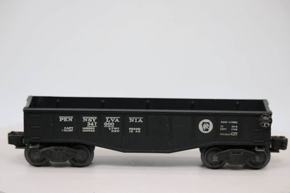 O Scale Train Lionel Pennsylvania Black Gondola 347000 #2452 Staple ended trucks SKU#007058 PLEASE see photos for detailed condition!! There may be pieces that are missing or broken including, but not limited too, couplers, brake wheels, steps, ladders, railings, etc. May need detailed cleaning. PLEASE LOOK AT THE PHOTOS CAREFULLY BEFORE PURCHASING!! If you are purchasing more than one item from us and would like combined shipping, PLEASE request an adjusted invoice from us while still in the cart and BEFORE paying. eBay does not usually calculate combined shipping accurately and you might get overcharged. Please be aware that when we photograph items, we use lighting that will show the details well. Although we try to present the product as accurately as possible, the lighting may affect the overall look of the item by appearing lighter/darker or possibly a different hue than the actual item. Depending on the type of lighting you have in your home, there may be some differences between the photos and the actual item. If this is a concern of yours, please feel free to request additional photos made in natural lighting or ask for a more detailed description of the item PRIOR TO PURCHASE! PLEASE NOTE: We greatly appreciate your interest in our item for sale. We look forward to a pleasant, quick and satisfying transaction for everybody, so please note the following information before bidding. Thank you! ITEM DESCRIPTIONS: * We will try to describe items well and provide plenty of photos. Please review these carefully before bidding or purchasing. * Only the items pictured and described are what you will receive when purchased. * We will occasionally offer an item clearly marked "AS-IS". This means that we are not sure if it works because we are unable to test it for whatever reason. We will offer these at a discounted price than a similar "working" item. It is possible that these items will work fine, but it also is possible that these items are more useful for their parts. Please only bid on or purchase these items if you are well aware of this, as we will only provide refunds of actual item price (no shipping cost refunds) for these items. * If you have any questions that aren't addressed by the descriptions or photos, please feel free to ask before you bid. SHIPPING: * We usually do not offer shipping to international addresses, but ARE WILLING TO TAKE CONSIDERATIONS. * We try to pack items as carefully as possible, but damage may occur during shipping. If you receive an item that was damaged in shipping, please contact us and we will work with you to resolve the problem. * We will combine shipping costs for all items the same buyer purchases from us within 2 days. Please wait to pay for items until you're done shopping with us. Please contact us if you're expecting to buy more items from us, or to have us adjust the shipping costs. * We will usually ship items out within 24 hours of payment being received Sunday through Friday at noon. We will notify the buyer if there will be a delay in shipping for some reason. Please allow additional time for holidays and weekends when the post office is closed. If payment is received after noon (EST) on Friday, the item might not be shipped until the following Monday. * We do try to recycle shipping materials as much as possible. RETURNS: We abide by eBay's Money Back Guarantee. We definitely want our customers to be happy with their purchase! You may return an item within 30 days of receiving it with the following guidelines: * If the item is defective or damaged (unless we clearly marked the listing "AS-IS"), the buyer will receive a full refund after the buyer returns it and it is received by us. Customers who falsely claim their item is defective, damaged, or not as described in order to receive a full refund and free return shipping will be permanently blocked from making future purchases from us. * If the item is as described (including "AS-IS" items) and the buyer decides for any other reason than defective/damaged to return it, only the actual price of the item will be refunded once it has been returned and it is received by us. The buyer will be asked to pay all original and return shipping charges. This includes all reasons other than defective/damaged, including wrong size, wrong type, changed mind, etc. All "AS-IS" items will fall into this category of return. Please make sure the item is what you want before purchasing it. * Please contact us before initiating a refund request. FEEDBACK: We always leave feedback at the end of transaction. We consider the transaction to be over when we receive feedback from the buyer confirming the item arrived satisfactorily. If you are unsatisfied with your purchase please contact us before leaving neutral or negative feedback. WE APPRECIATE POSITIVE FEEDBACK IF YOU ARE SATISFIED WITH YOUR PURCHASE! THANK YOU FOR YOUR INTEREST IN THIS ITEM!