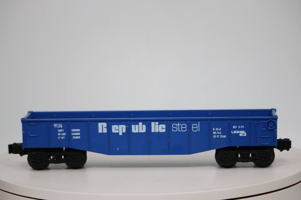 Lionel O Scale Republic Steel #9136 MPC Era Gondola Train SKU#008275 PLEASE see photos for detailed condition!! There may be pieces that are missing or broken including, but not limited too, couplers, brake wheels, steps, ladders, railings, etc. May need detailed cleaning. PLEASE LOOK AT THE PHOTOS CAREFULLY BEFORE PURCHASING!! If you are purchasing more than one item from us and would like combined shipping, PLEASE request an adjusted invoice from us while still in the cart and BEFORE paying. eBay does not usually calculate combined shipping accurately and you might get overcharged. Please be aware that when we photograph items, we use lighting that will show the details well. Although we try to present the product as accurately as possible, the lighting may affect the overall look of the item by appearing lighter/darker or possibly a different hue than the actual item. Depending on the type of lighting you have in your home, there may be some differences between the photos and the actual item. If this is a concern of yours, please feel free to request additional photos made in natural lighting or ask for a more detailed description of the item PRIOR TO PURCHASE! PLEASE NOTE: We greatly appreciate your interest in our item for sale. We look forward to a pleasant, quick and satisfying transaction for everybody, so please note the following information before bidding. Thank you! ITEM DESCRIPTIONS: * We will try to describe items well and provide plenty of photos. Please review these carefully before bidding or purchasing. * Only the items pictured and described are what you will receive when purchased. * We will occasionally offer an item clearly marked "AS-IS". This means that we are not sure if it works because we are unable to test it for whatever reason. We will offer these at a discounted price than a similar "working" item. It is possible that these items will work fine, but it also is possible that these items are more useful for their parts. Please only bid on or purchase these items if you are well aware of this, as we will only provide refunds of actual item price (no shipping cost refunds) for these items. * If you have any questions that aren't addressed by the descriptions or photos, please feel free to ask before you bid. SHIPPING: * We usually do not offer shipping to international addresses, but ARE WILLING TO TAKE CONSIDERATIONS. * We try to pack items as carefully as possible, but damage may occur during shipping. If you receive an item that was damaged in shipping, please contact us and we will work with you to resolve the problem. * We will combine shipping costs for all items the same buyer purchases from us within 2 days. Please wait to pay for items until you're done shopping with us. Please contact us if you're expecting to buy more items from us, or to have us adjust the shipping costs. * We will usually ship items out within 24 hours of payment being received Sunday through Friday at noon. We will notify the buyer if there will be a delay in shipping for some reason. Please allow additional time for holidays and weekends when the post office is closed. If payment is received after noon (EST) on Friday, the item might not be shipped until the following Monday. * We do try to recycle shipping materials as much as possible. RETURNS: We abide by eBay's Money Back Guarantee. We definitely want our customers to be happy with their purchase! You may return an item within 30 days of receiving it with the following guidelines: * If the item is defective or damaged (unless we clearly marked the listing "AS-IS"), the buyer will receive a full refund after the buyer returns it and it is received by us. Customers who falsely claim their item is defective, damaged, or not as described in order to receive a full refund and free return shipping will be permanently blocked from making future purchases from us. * If the item is as described (including "AS-IS" items) and the buyer decides for any other reason than defective/damaged to return it, only the actual price of the item will be refunded once it has been returned and it is received by us. The buyer will be asked to pay all original and return shipping charges. This includes all reasons other than defective/damaged, including wrong size, wrong type, changed mind, etc. All "AS-IS" items will fall into this category of return. Please make sure the item is what you want before purchasing it. * Please contact us before initiating a refund request. FEEDBACK: We always leave feedback at the end of transaction. We consider the transaction to be over when we receive feedback from the buyer confirming the item arrived satisfactorily. If you are unsatisfied with your purchase please contact us before leaving neutral or negative feedback. WE APPRECIATE POSITIVE FEEDBACK IF YOU ARE SATISFIED WITH YOUR PURCHASE! THANK YOU FOR YOUR INTEREST IN THIS ITEM! Look closely at the pictures to see further details. PLEASE see photos for detailed condition!! PLEASE LOOK AT THE PHOTOS CAREFULLY BEFORE PURCHASING!! If you are purchasing more than one item from us and would like combined shipping, PLEASE request an adjusted invoice from us while still in the cart and BEFORE paying. eBay does not usually calculate combined shipping accurately and you might get overcharged. Please be aware that when we photograph items, we use lighting that will show the details well. Although we try to present the product as accurately as possible, the lighting may affect the overall look of the item by appearing lighter/darker or possibly a different hue than the actual item. Depending on the type of lighting you have in your home, there may be some differences between the photos and the actual item. If this is a concern of yours, please feel free to request additional photos made in natural lighting or ask for a more detailed description of the item PRIOR TO PURCHASE! There may be pieces that are missing or broken including, but not limited to, couplers, brake wheels