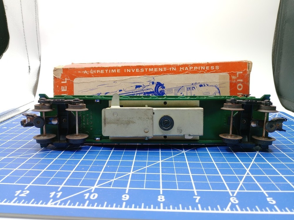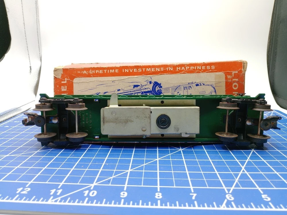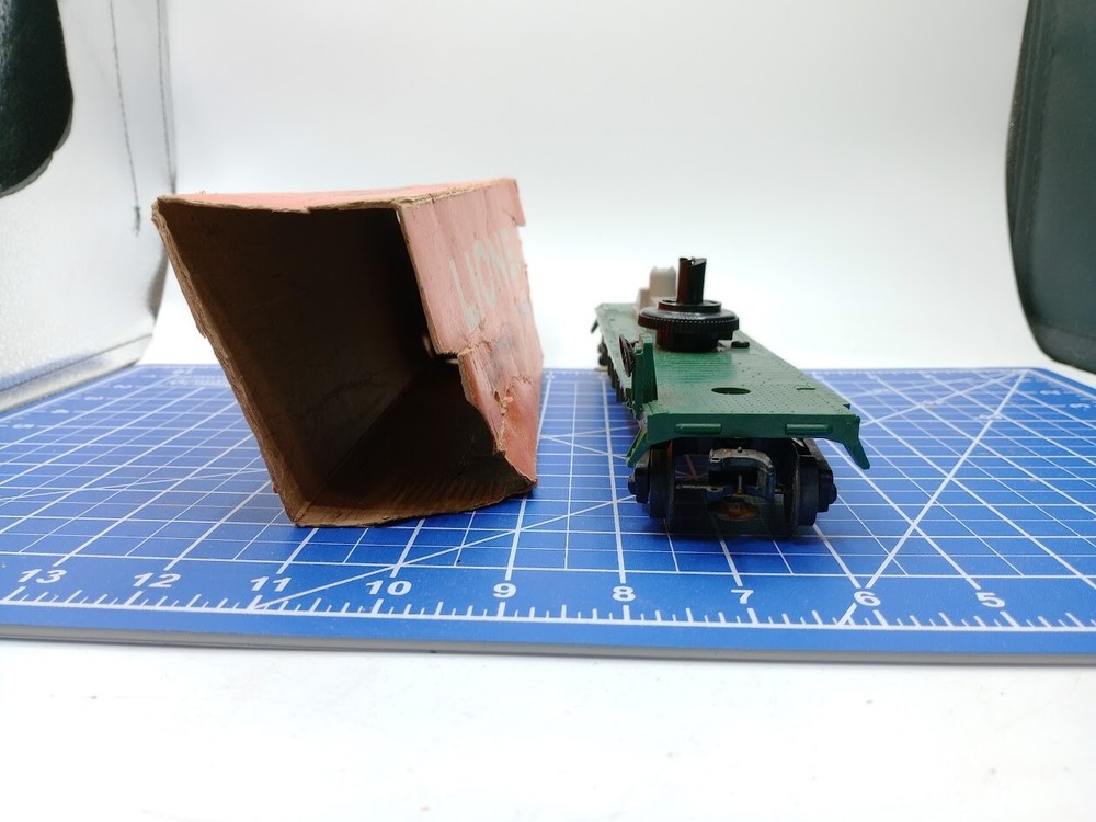 Theme:TransportationGrade:C-5 GoodFeatures:Limited EditionScale:1:48Material:Diecast, PlasticBrand:LionelGauge:OMPN:3509Control System:AnalogColor:GreenCountry of Origin:ChinaAssembly Status:Ready to Go/Pre-builtCorporate Roadname:UnknownReplica of:Freight carRail System:Three-Rail SystemVintage:YesPower Type:ACYear Manufactured:1961Type:Flat CarSeller Notes:“Comes with a box that is damaged but the train is tested and runs excellent.”