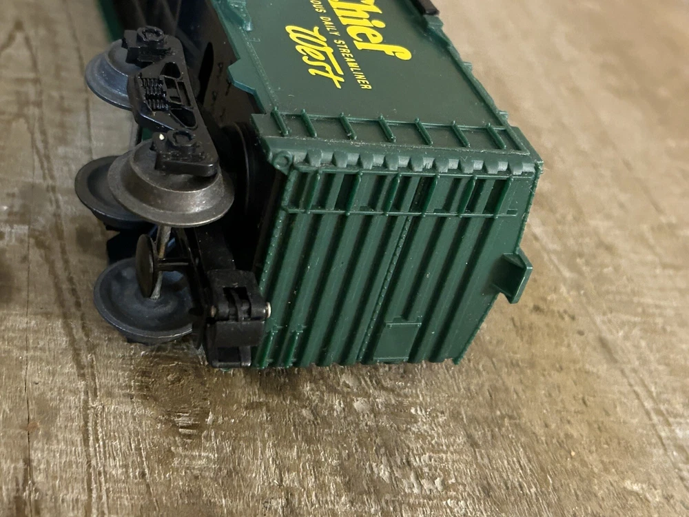This Lionel Santa Fe The Chief Box Car #16263 is a great addition to any model railroad collection. With its three-rail system and green color, it accurately represents the Santa Fe corporate roadname. The box car is made of plastic and features the transportation theme of the Santa Fe replica. It is compatible with O gauge tracks and will make a great display piece for any railroad enthusiast.