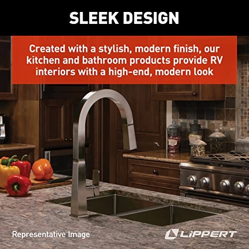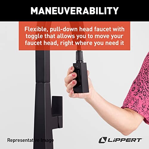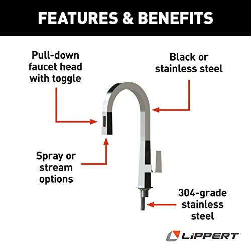 Special Features: Pull Down Sprayer Item Height: 3 Recommended Uses For Product: Kitchen Model Name: Lippert Flow Max Pull-Down Kitchen Faucet - Stainless Steel Included Components: Faucet EAN: Does Not Apply Number of Pieces: 1 UPC: 848150044693 Installation Type: single_hole_deck_mount, Single Hole MPN: Does Not Apply Warranty Type: limited Country of Origin: China Number of Handles: 1 Item model number: 2022007783 Special Feature: Pull Down Sprayer Finish Type: black Material: Stainless Steel Exterior: Stainless Steel Customer Reviews: 5.0 out of 5 stars Handle Material: Stainless Steel Item Width: 12 Spout Design: Curved Pull Down Manufacturer Part Number: 2022007783 Global Trade Identification Number: 00848150044693 Item Length: 18 Brand: Does Not Apply Manufacturer: Lippert Handle Type: Lever Type: Does Not Apply Mounting Type: Deck Mount Product Dimensions: 18 x 12 x 3 inches Item Weight: 4.5 Pounds Date First Available: April 5, 2023 gtin13: Does Not Apply