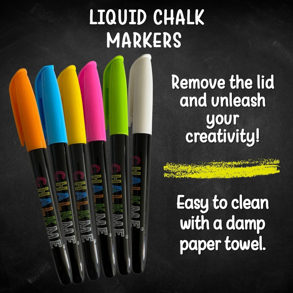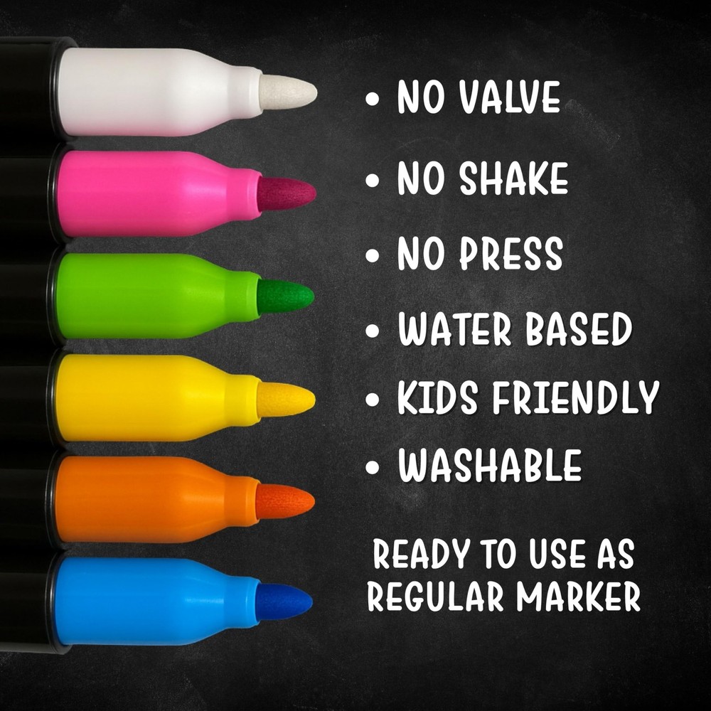 Designed for smooth, consistent writing and drawing, Chalk Markers provide a clean and reliable way to create on chalkboard-style surfaces. Compatible with water bottles and other non-porous surfaces, these water-based, dust-free markers are ideal for clear markings, notes, and decorative designs. Easy to apply and erase, they offer a practical solution for everyday creative use Non-valve Chalk Markers: Ready To Use And Unleash The Creativity Drawing last all day: Markers are easy to clean with dish soap and water, allowing you to create a new picture every day No Mess, No Dust: Erasable chalk markers easy to wipe off with a damp cloth Erasable Pens for Windows, Glass, Chalkboard and Blackboard Bright Colors : 6 vibrant shades markers for endless drawing No Shaking Needed: ready to use instantly no shaking or pressing required. Just uncap and start creating