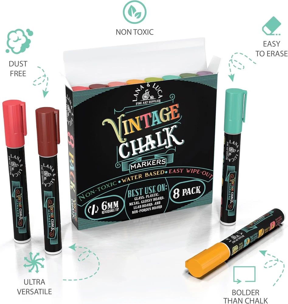 Store New Arrivals Add to Favorite View Feedback Contact Fast deliveries to the customer's home Quality customer service John Make the customers happy! Liquid Chalk Markers - Wet Erase Marker Pens - for Chalkboards Signs, Windows, Blackboard, Glass - 6Mm Reversible Tip (8 Pack) - Vintage Colors Multicolor Description Fun and Easy to Use - Time to replace the old dusty chalk with bold neon chalk markers Made for All Ages - Dustless formula is both and safe for use at home Made for Everyone - Whether you're a Teacher, Mom, Student, Artist, Kid or Bistro Owner, these are the chalk markers you're looking for Comes Off easy - When you’re ready to write and start fresh, a mere wipe of a wet paper towel will remove your erasable chalk markers completely and easily from almost any non-porous surface The LANA and LUCA Promise - If for any reason, you're not completely satisfied, simply contact us and we'll take care of it Ink color: Multicolor Vintage Colors Liquid Chalk Markers perfect for writing on Chalkboards, Windows, Glass, wine Glasses, Whiteboards and just about any non-porous material. Item Weight 7.4 ounces Number of Items 8 Color Vintage Line Size 6 months Manufacturer Part Number CRLLVC8PK Ink Color Multicolored Recommended Uses For Product Glass,Signs Point Type Bold Package Dimensions 6.02 x 5.59 x 0.94 inches Size 1 Count (Pack of 8) ABOUT US We offer the best prices around on high quality products. Our E-store includes media such as books, movies, music and games while offering electronics, toys, sporting apparel, clothing, tools, general home, garden items and more. SHIPPING We are always working hard to ensure your package arrives as soon as possible. Please understand that some factors like weather, high postal traffic, and the performance of shipping companies are outside of our control. We offer free shipping to the lower 48 states and ship within 2 business days of payment, usually sooner. We do not accept P.O. Boxes. Please provide a physical address. For shipping outside of the continental USA, we only use eBay's Global Shipping Program. The item is shipped to KY and then sent to the rest of the world. International customers are responsible for all duties and taxes. Continue to 'check out' to calculate costs for shipping the item to your country. Messages regarding eBay's Global Shipping Program MUST be directed at eBay EXCLUSIVELY. RETURNS We offer a 30-Day Return Policy on items in which you are not completely satisfied with. You have the option of a full-refund or an exchange of the item. No returns are available on items shipped outside of the USA PAYMENT We accept PayPal. CONTACT US This page content is yet to come Please ad us to your favorite seller and visit again later Thank You CUSTOMER SATISFACTION We try our very best to make sure every customer is completely satisfied. If there's a problem, message us! We're happy to help. WE ACCEPT