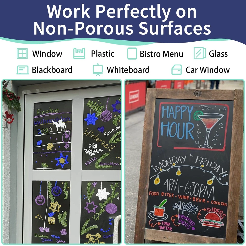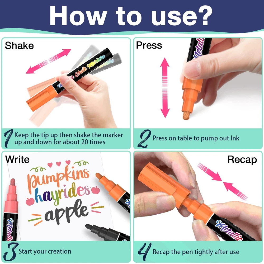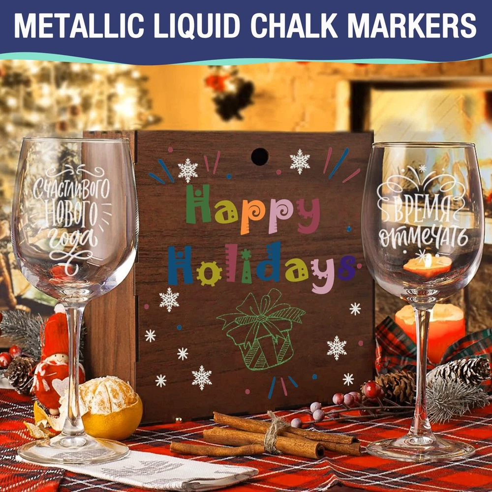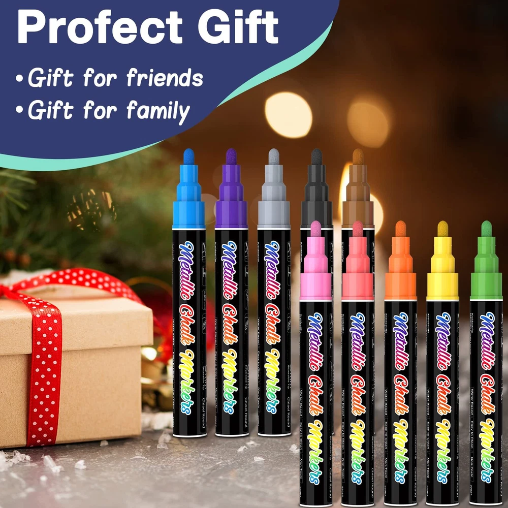 【Sparkling Metallic Colors】AKARUED metallic liquid chalk markers pen feature a new upgraded ink to give customers a new metallic colour with thick and even coverage. Each liquid chalk pens has a durable nib. One end is a chisel point, and the other end is a bullet tip. To change, simply pull the tip out and flip it over, and you could choose between a bullet and a chisel to draw fine, broad or bold line. Create eye-catching artwork with this liquid chalk marker with a glitter metallic sheen. 【High Quality Ink & Safe for kids】Liquid chalk markers erasable markers use high quality, Non-Toxic, and bright ink, conforms to ASTM D-4236, They are erasable, water-based, non-toxic, odorless, dustless, and huge capacity, More durable than any other liquid window markers, AKARUED premium chalk board marker pens draw in brighter, smoother lines than any other brand. Tried, tested, and loved by thousands of professionals, artists, we guarantee you'll be impressed! 【Easy to Erase】Liquid chalk board markers is completely dust-free which makes cleanup a breeze for these erasable pens! It erases from most non-porous surfaces with a damp cloth. Such as chalkboard, chalk labels and other matte finishes. NOTE: some chalkboards are Porous and some Non porous, all liquid chalk marker are designed to be used on a Non Porous surface so Please test on a small area first. 【Works on Most Non-Porous Surfaces】Our erasable car window chalk markers works great for decorating any cars, window, glass door, windshield, posters, mirror, chalkbroad, craft paper, stencils, blackboards, white Boards, bistro menu, wedding sign, classroom black board, metal, LED writing boards, plastic containers, porcelain, Christmas banner, graduation, cafe menus, lunch menu, gym boards, poster, holiday decorations, Non-Porous chalkboards, LED Signs, and most Non-Porous surfaces. 【Fast After-Sales Response】Whether you're giving this colored chalk markers pack as a Christmas gift or using them to create festive DIY crafts, this set of craft supplies is a great way to get into the holiday spirit! If you are not 100% satisfied with AKARUED color metalic liquid chalk markers, Please do not hesitate to contact us for any question, we will solve it for you within 24 hours.