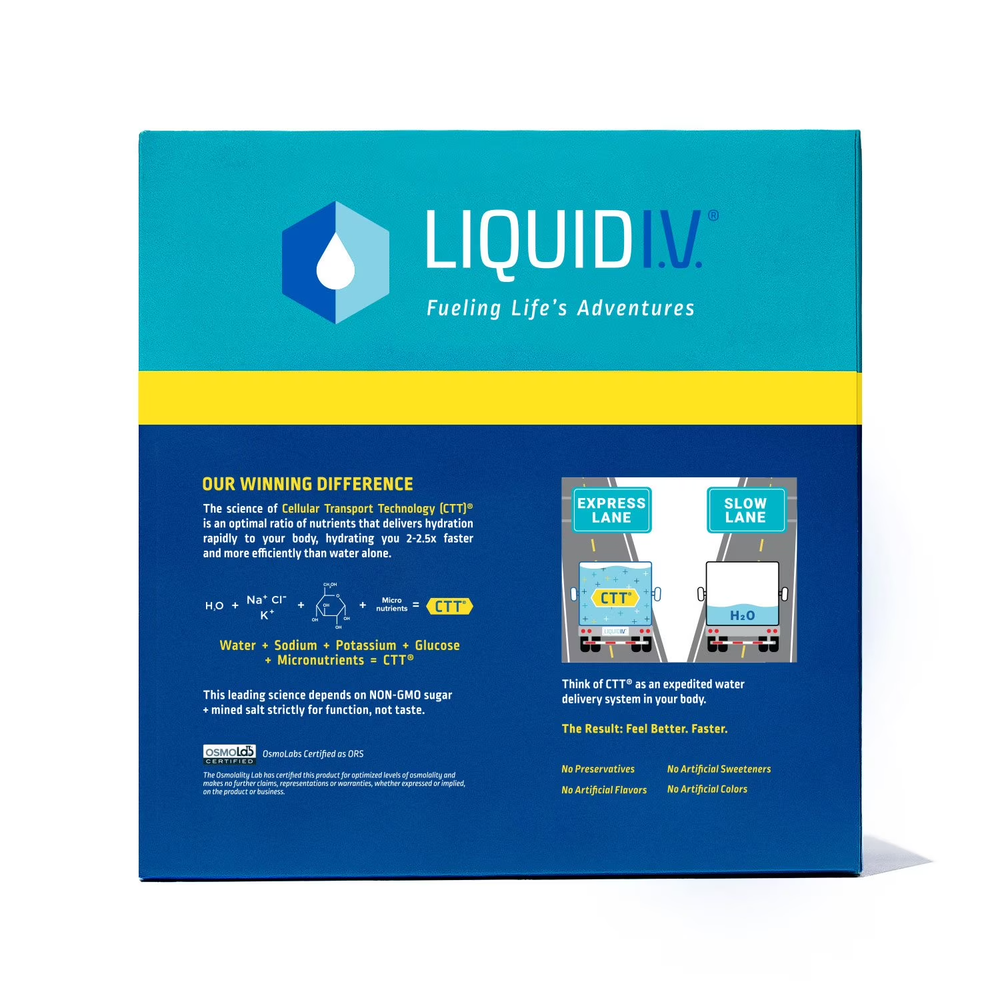 Product details Liquid I.V.'s Hydration Multiplier is a great-tasting, non-GMO electrolyte powder drink mix powered by Cellular Transport Technology (CTT) designed to enhance rapid absorption of water and other key ingredients into the bloodstream. How It Works Typically, when you drink fluids, they pass through the entire digestive system, losing water before your body can absorb it. CTT uses a precise ratio of sodium, glucose, and potassium to create an osmotic force that allows water to be delivered to the bloodstream earlier on in the digestive system. Liquid I.V. Hydration Multiplier can hydrate faster and more efficiently than water alone. One serving contains three times the electrolytes of traditional sports drinks and five essential vitamins. How We Got Our Start While working with a professional baseball team, Liquid I.V. Founder & CEO Brandin Cohen saw firsthand the lack of natural, effective electrolyte drinks. Inspired, he partnered with a group of top nutrition scientists to create Hydration Multiplier and the breakthrough science of CTT. What Makes Our Product Unique? Liquid I.V. is powered by the breakthrough science of Cellular Transport Technology, or CTT, which is designed to enhance rapid absorption of water and other key ingredients into the bloodstream. Translation? Feel better. Faster. Why We Love What We Do Liquid I.V.'s mission is to Change the World. To us, that means helping people everywhere live better lives. We do that by delivering the highest-quality products, donating a serving of Liquid I.V. for every purchase, and working towards a future of full sustainability.