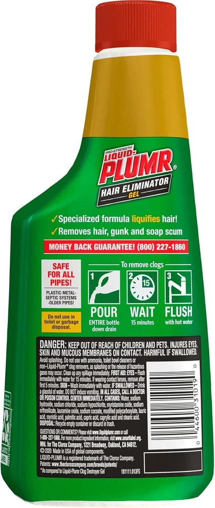 DRAIN CLOG REMOVER: Liquid-Plumr Hair Clog Eliminator is specially formulated for hair clogs, the most common reason for clogs in your drain POWERFUL DRAIN OPENER: This hair clog remover contains 70%* more actives to clear slow-running drains the first time. *As compared with Liquid-Plumr Full Clog Destroyer Plus Pipeguard SAFE ON ALL PIPES: This drain cleaner is safe for all septic systems and pipes, including PVC, plastic, metal and old drain pipes; Do not use in toilets or garbage disposals WORKS ON MULTIPLE DRAIN TYPES: Removes thick hair clogs safely and effectively on slow drains in bathroom sinks, kitchen sinks, showers and bathtubs DESTROYS HAIR CLOGS: Forget a tricky drain snake and use this drain opener to destroy the toughest hair clogs 16 fluid ounce bottle of professional strength drain cleaner for hair clogs Thick gel coats hair, eliminating hair clogs, the number one cause of blocked drains Just pour, wait 15 minutes and flush hair clog away Safe for septic systems and all pipes, including PVC, plastic, copper and old pipes Saves time and money by empowering you to clear drains yourself Liquid-Plumr Hair Clog Eliminator gets rid of the toughest hair clogs. Our powerful gel destroys hair clogs the first time with 70% more actives. Hair Clog Eliminator effectively unclogs your bathtub, shower, bathroom sink and kitchen sink, and clears slow running drains. It is also specially formulated for hair clogs, the most common reason for clogs in your drain. Its safe for all septic systems and pipes, including PVC, plastic, metal and old pipes. Do not use in toilets or garbage disposals or with ammonia, toilet bowl cleaners or non-Liquid-Plumr clog removers (to avoid the release of hazardous gas). Liquid-Plumr contains biodegradable surfactants and no phosphorus. Excessive heat or cold may cause some of the ingredients in Liquid-Plumr to form clumps, but this should not affect its performance.