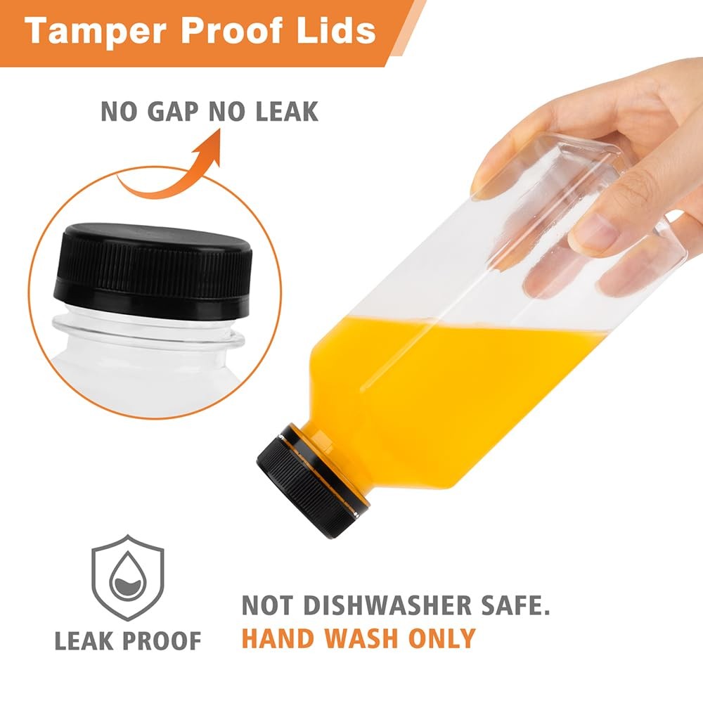 Lissomballon 10 Pcs 12oz Plastic Juice Bottles With Caps, Reusable Food Clear Description Features: [Plastic Bottles with Caps]: Package includes 10 Pcs 12 oz empty bottles, 10 tamper-proof black bottle caps, 10 Pcs beautifully labels and a cleaning bottle brush [100% Food Grade Bottles]: Our reusable juice bottles are made of food grade PET materials. It's BPA Free, no chemical leaching which is safe and tasteless so you can fully enjoy your drinks [Multifunctional]: Our 12 ounce premium plastic bottle with lid is designed for juice, milk, coffee, smoothies and other beverages, perfect for birthday parties and friends gatherings, let's enjoy it together [Portable and leak-proof]: The juice container has a sealed lid to prevent leakage, is lightweight and durable, reusable and perfect for travel. Tip: Can't be cleaned in the dishwasher [Risk Free Purchase]: We have been pursuing is to provide customers with satisfactory products and services, if you have any problems in the shopping process, please contact us, we will give you a 100% satisfactory answer within 24 hours Product Details: Handling We will ship all orders within 1 business day of payment. Delivery We Do Not Ship Outside of the Continental US. Return Policy All items qualify for returns within 30 days of receipt. Buyer is responsible for return shipping on any item that is not damaged. Feedback We take our reputation seriously, we buy and sell online, so we understand the value of trust. If you are unsatisfied with your order, please contact us and we will work with you to resolve it to your satisfaction.