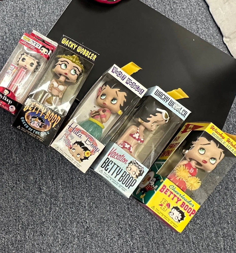 Listing Title: Betty Boop Wacky Wobbler Bobblehead Bundle – Set of 4 by Funko Description: This is a rare collection of four Betty Boop Wacky Wobbler bobbleheads by Funko. Each bobblehead showcases Betty Boop in a different fun and playful theme, perfect for collectors or fans of this iconic character. While three of the bobbleheads are in mint condition and remain unopened in their original boxes, the third one from the left (second one from the right) shows some wear on the box and has been opened, but none of the items have been used. Details: • Brand/Manufacturer: Funko • Product Line: Wacky Wobbler Bobbleheads • Condition: • Three Bobbleheads: Mint in original boxes, unopened. • One Bobblehead: Box shows wear and has been opened, but item remains unused. • Included Themes: 1. Vacation Betty Boop: Dressed in a swimsuit with sunglasses for a sunny getaway. 2. Cheerleader Betty Boop: Spirited with pom-poms and a bright cheerleading outfit. 3. Queen of the Nile Betty Boop: Stunning Egyptian-inspired look with regal details (box shows wear and has been opened). 4. Hula Boop Betty Boop: Tropical-themed with a grass skirt and lei, channeling Hawaiian vibes. • Year of Production: As indicated on the packaging. • Collector’s Note: A complete set of themed bobbleheads, perfect for Betty Boop fans or Funko enthusiasts.